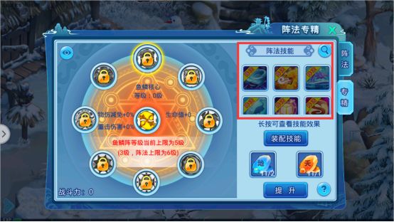 在 专精界面 右侧可以看到 阵法技能,阵法技能一共有8个,而不同的阵法技能需要指定3个阵法核心均达到30级才会开放,随着相应核心等级提升技能效果也会增强。