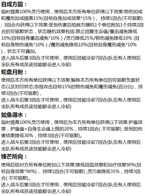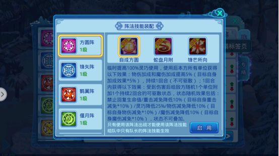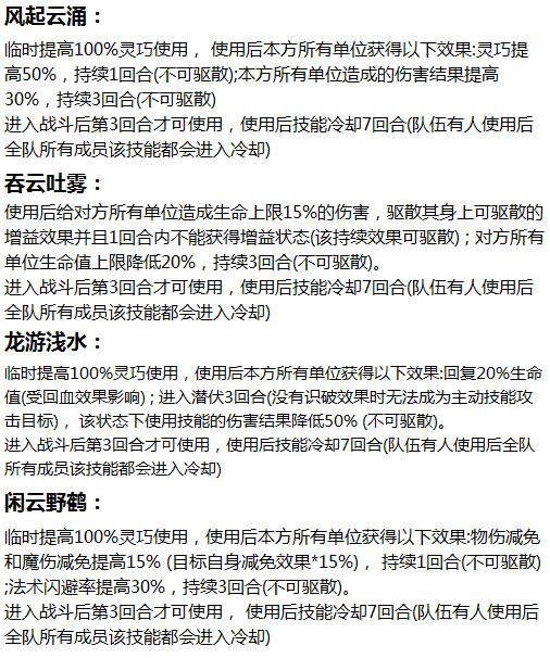Ps.组队中只有队长的阵法技能生效,而阵法技能全队玩家都可以使用,但是使用后所有人的阵法技能都会进入冷却状态(如果一回合内多个队友使用则先出手的正常使用,后出手的变为普通攻击)。