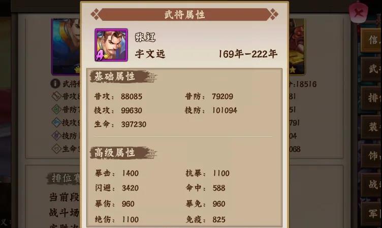 武将全属性主要包括武将的基础属性和高级属性,其中基础属性为:普通攻击、普通防御、技能攻击、技能防御以及生命值,而高级属性为:暴击值、抗暴击值、闪避值、命中值、暴击伤害值、暴伤免疫值、绝对伤害值及伤害免疫值。