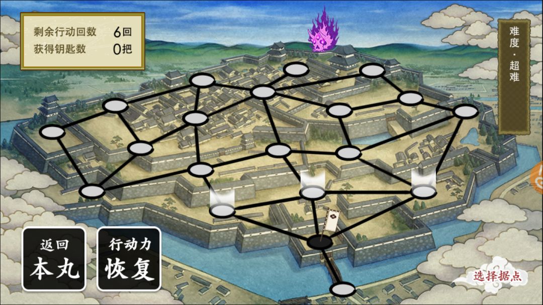 [注意,前者结局结算出来的奖励会在当局获得数打下折扣!!所以尽量在点数用完前进入boss点!!或者在赌点后保留1点行动值直接返回本丸]。