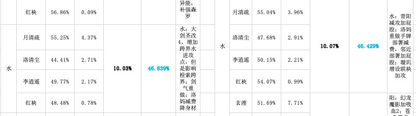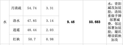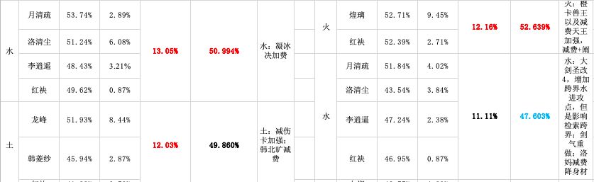 再看t3周期逍遥水的占比,比t2低了0.35%和至尊环境中t3周期的数据变动完全不同。而同样经过1.26更新后,洛水的单独胜率的上升幅度也大于至尊环境中同阶段的数据变。这两点也是为什么我在2.2.1里说:1.20更新的官方意图只有少数至尊玩家读到了(我可读不到,水神尚未毕业,也是在整理数据后才明白过来),因为那次更新让很多人都认为只是在补尝夙瑶水。