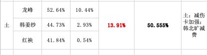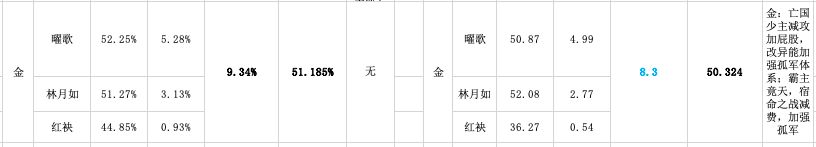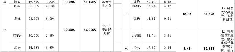 53+%的胜率触动了官方的神经,且明显超出了合理区间(48%—52%),过高的强度迎来了1.20更新的削弱。从削弱的方向也可以证明,当时环境中的土就是传统的侠客,冲锋贴buff体系。经历削弱后的土在本月的数据变为双正常,但这个结果并非完全是官方的功劳。因为减伤的打法并没有被玩家认可,且吹猪的占比又减少了1.4+%,理论上土在t3也就是本轮月报周期,会变成一个低占比,正常胜率或者高胜率的属性,然而并没有,土的数据变得非常合理,不单是属性的两项数据,连主将占比也非常平衡(当然不包括红袂,你见过红袂土吗?好吧你见过我的)。问题就出在韩菱纱上,而韩菱纱为什么会出位呢—减灵土。