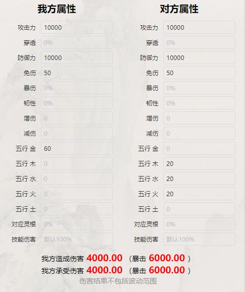 上图举例,同等攻防、减伤相同五行总数的情况下,在对面没有木有火的清况下,我们造成的伤害跟承受伤害。