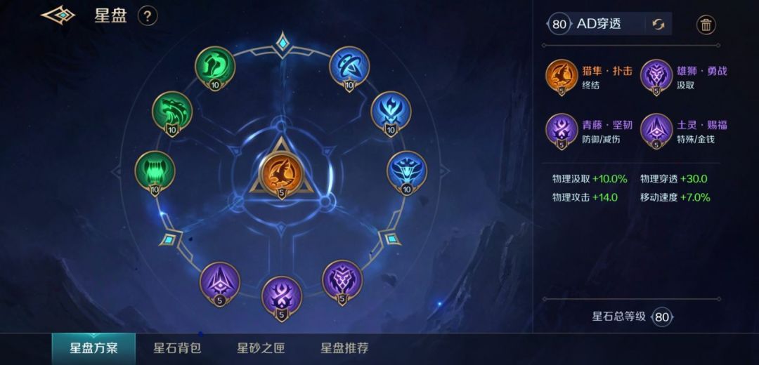 星盘我推荐这套,在保证输出的同时,还有吸血(紫色雄狮,血量越低吸血越多),在残血对拼时配合一技能回血经常可以能意外反杀。这套星盘兼顾爆发、续航、移速、经济、减伤。