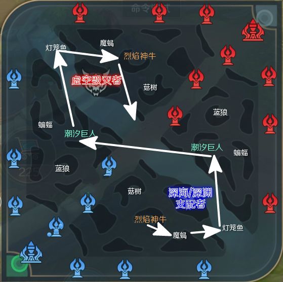 3.下路支援/击杀结束后,收掉灯笼鱼,去敌方潮汐巨人(蓝BUFF)反蓝扩大优势。如逆风或状态不佳时,跳过灯笼鱼和反蓝过程。