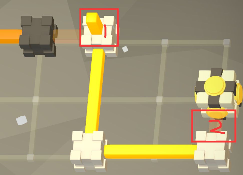 第四步,看到已激活的线路离最终方块只剩下一个单位的长度,这时选择1号位置的管道竖起,并移动到2号位置即可。