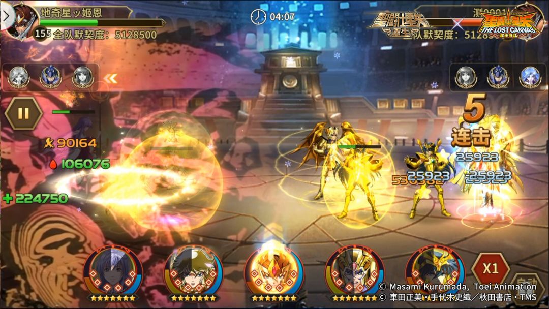 我方阵容:传说圣斗士·紫龙、神圣双子座·撒加、神圣处女座·沙加、女神·萨沙、阿赖耶识·沙加