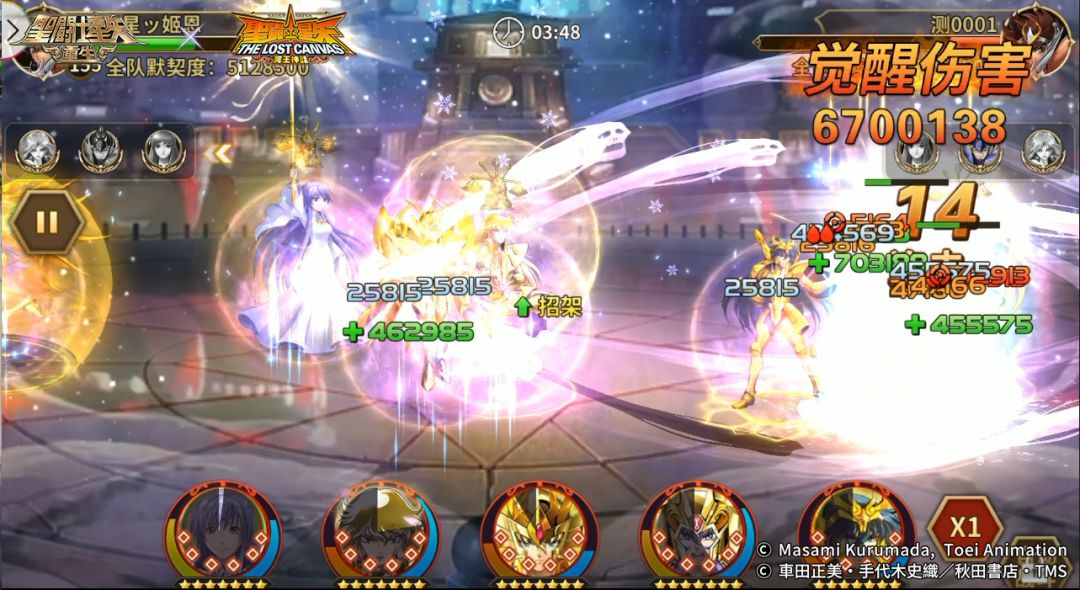 3分50秒,女神·萨沙频繁释放祈祷花环,给己方全体添加护盾,同时为两个角色回复生命值,这次回复了1712861、9255971生命值,本次回复对象为女神·萨沙自己和神圣处女座·沙加。