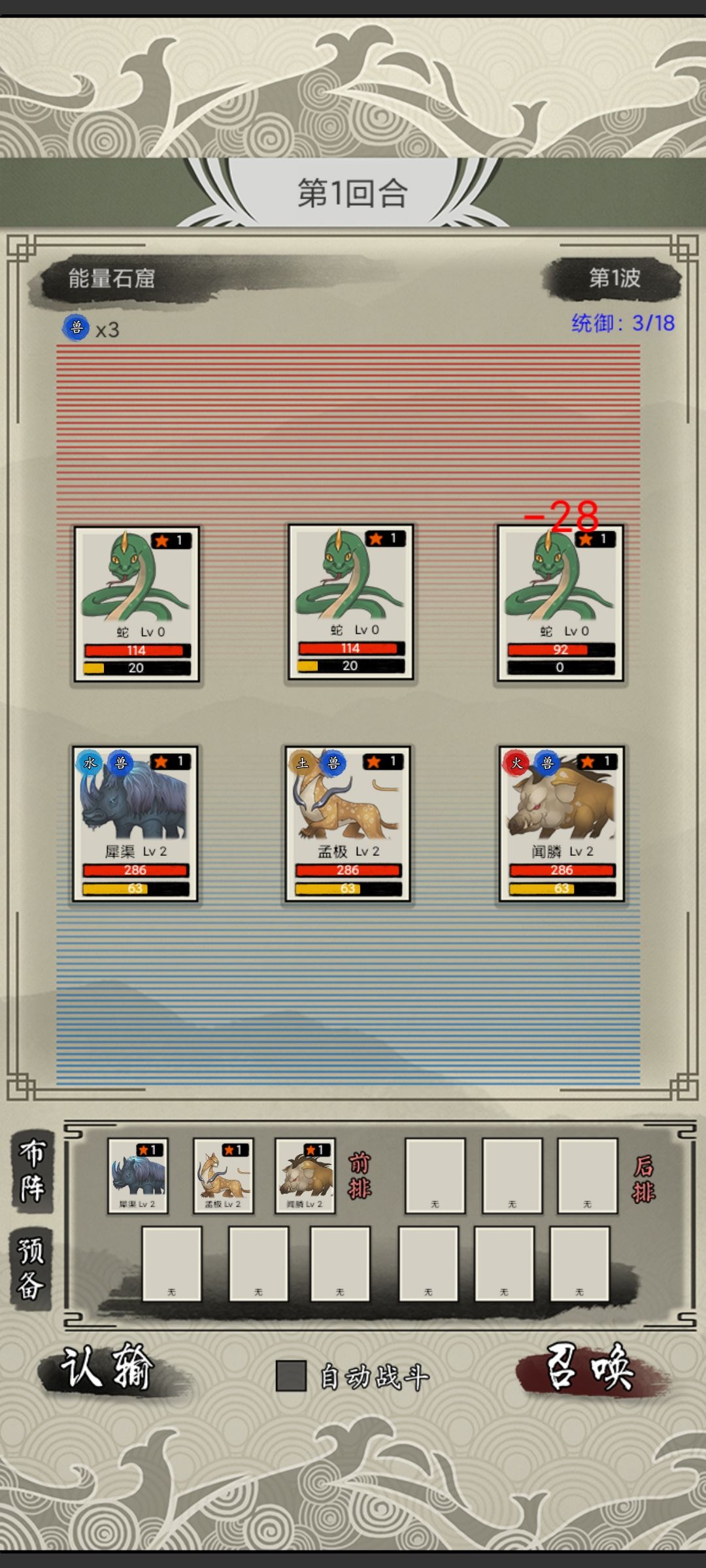 第一波,随便上三个500能量的兽,记住不要带治疗技能的