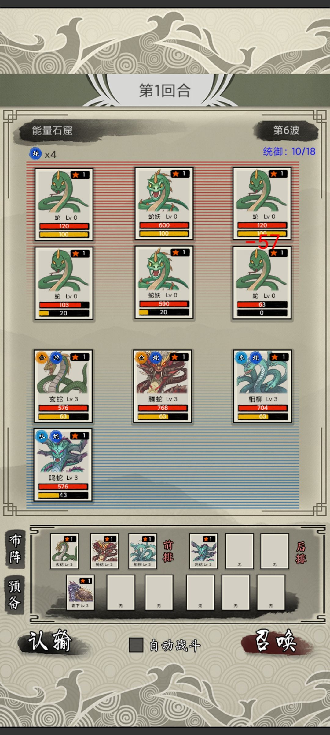 第三波开始用20搜索蛇属性的异兽,十点统帅3322,6选4