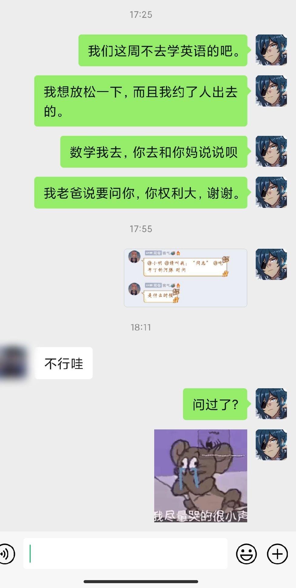 现在的家长,我不想去补习逼我去补习,呵呵,而且是我讨厌的科目,两个星期没玩了,好不容易考完试人家有空。就被搅黄了。