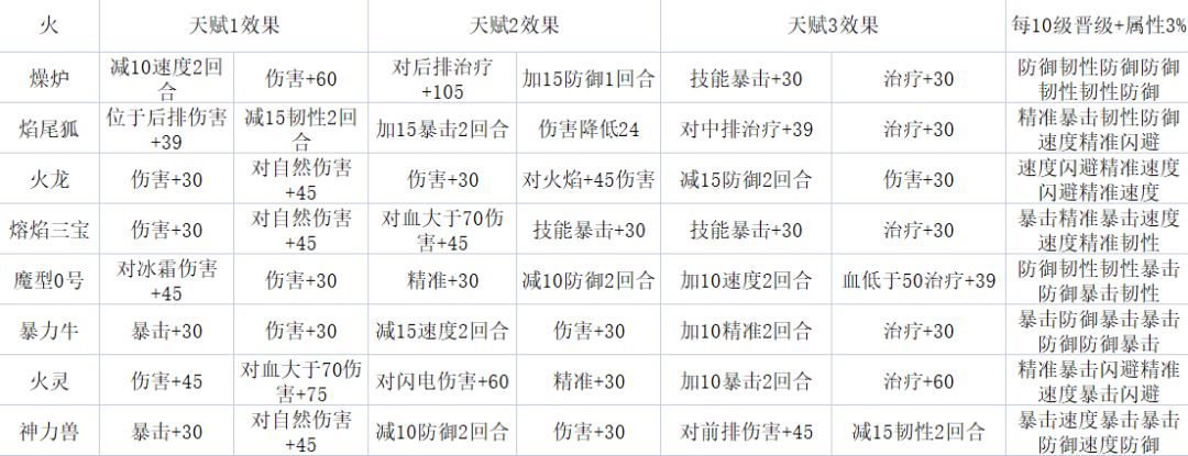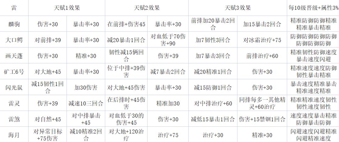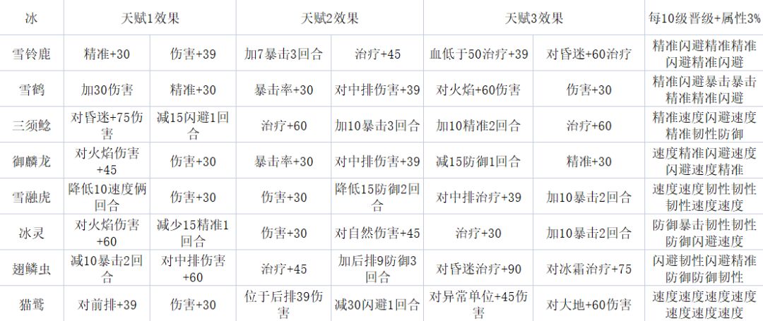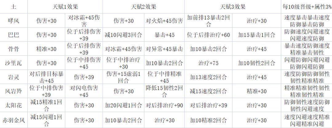 技能类天赋:每个精灵三个技能都分别带有两种增益性天赋。常见增伤、增疗、额外异常效果、额外属性改变效果。
