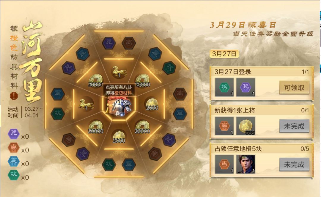 3.完成任务可获得“离”、“兑”、“震”、“坎”八卦,可用于点亮八卦(主公可点亮任意未点亮的八卦,点亮后不可反悔);