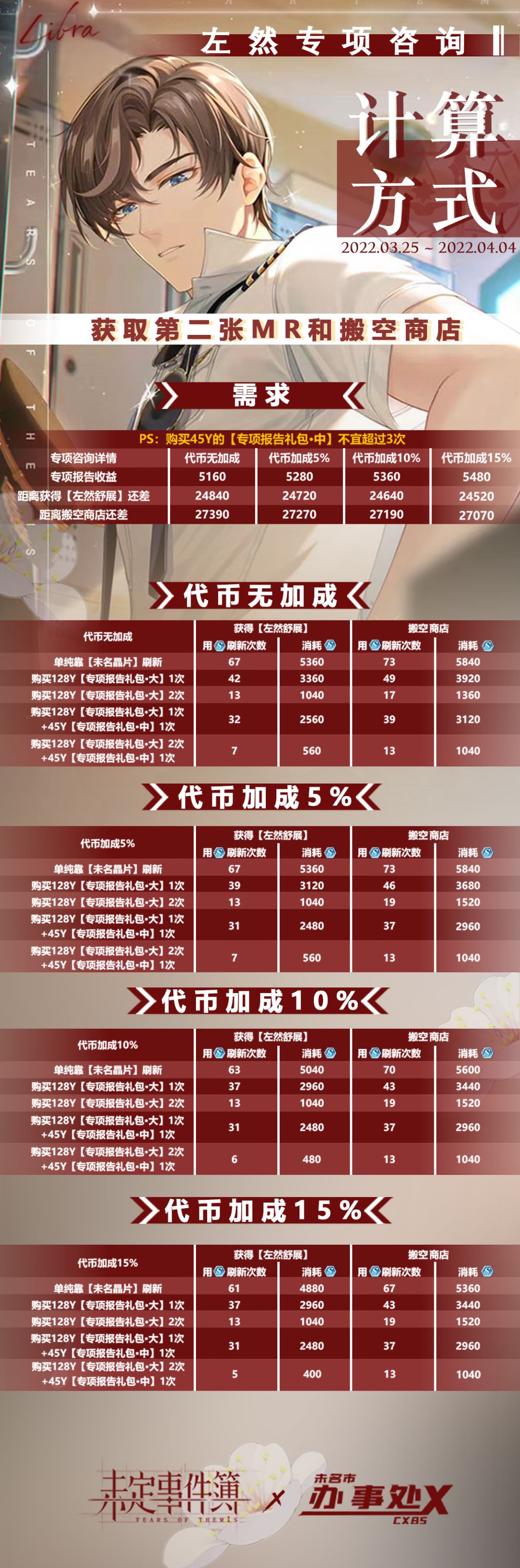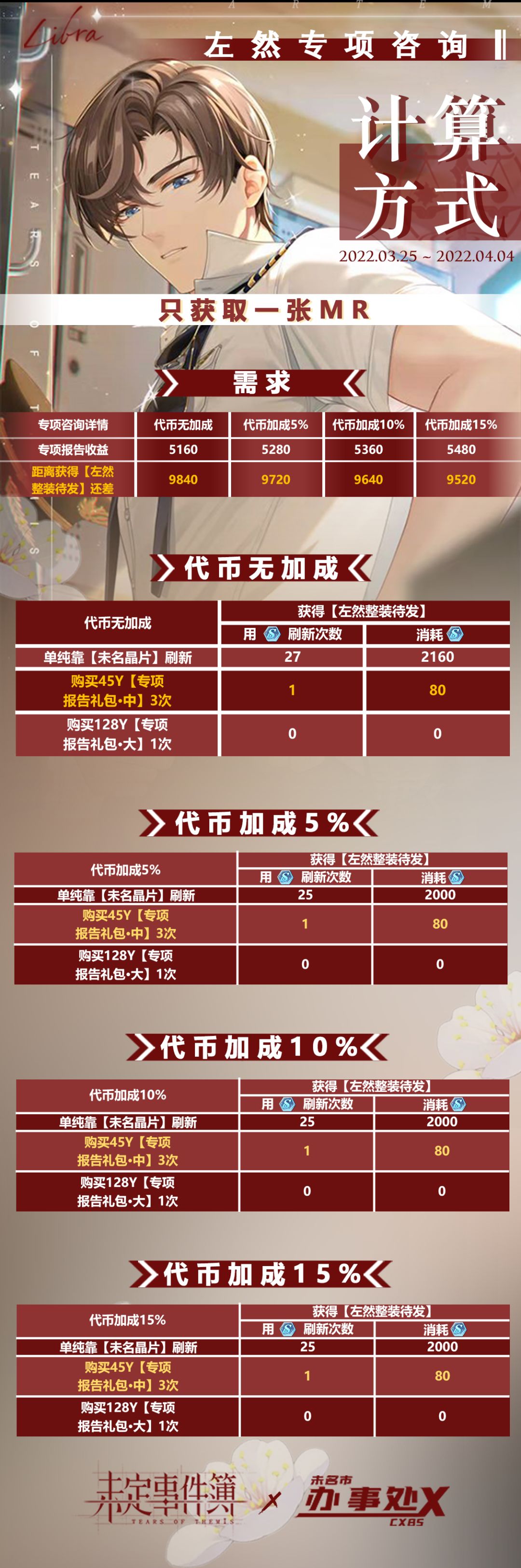 本次攻略分成了任务收益|供需关系|计算方式三个部分,因为考虑到部分律师已经有了【左然MR舒展】,且获取复刻MR与单纯获得【左然MR整装待发】所需刷新次数差异过大,所以拆成了两个攻略供大家各取所需~之后看接下来的活动是否延续该形式后我们将再制作全新版本的【专项咨询MR通用攻略】~