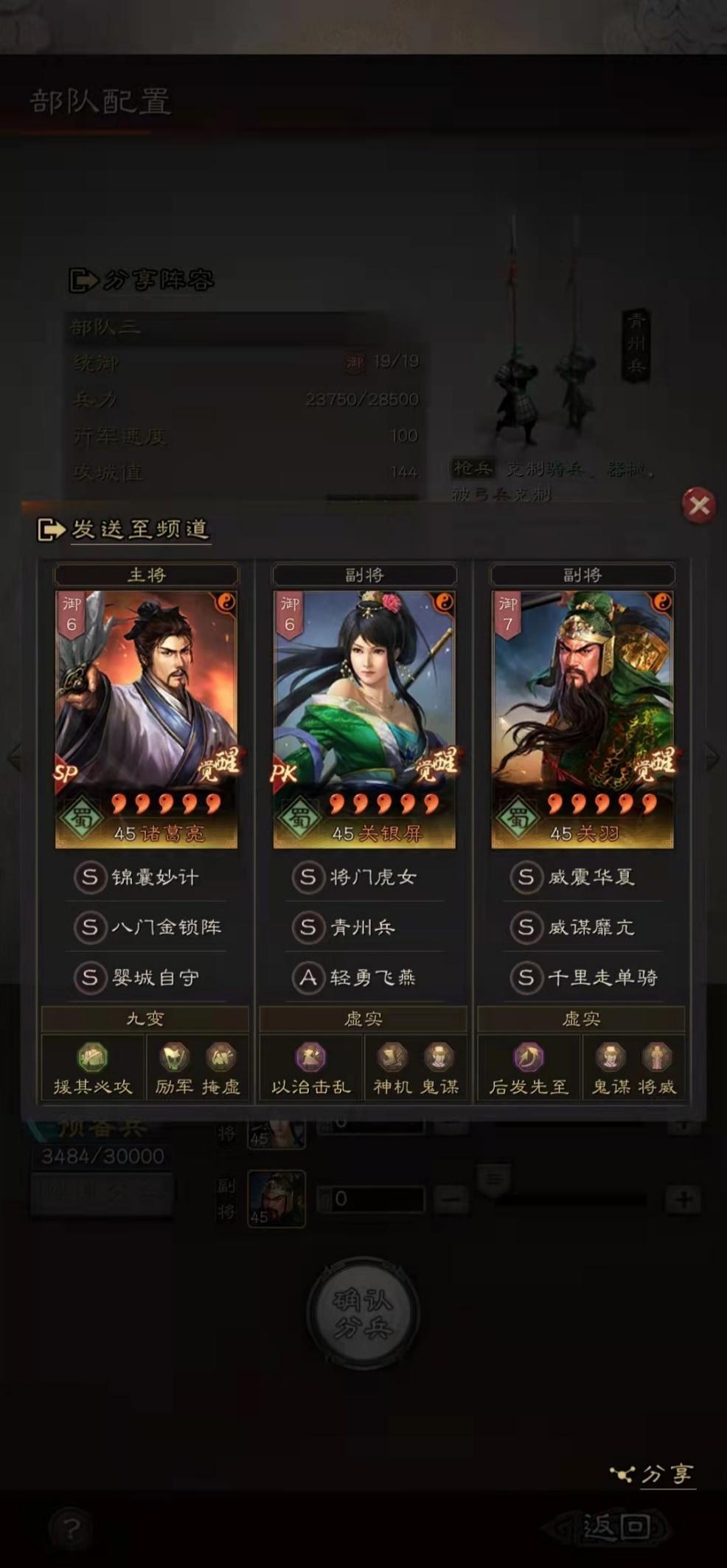 PS:大佬说,在很多战法被占用的情况下,这个队伍做顶配的话,轻勇飞燕换成据水断桥。但在实战效果方面,SP诸葛亮虽然能给这队更高的稳定性,但毕竟本质上还是依赖不被控、主动战法发动,因此有提升,但是并没有质变到T0队伍的行列中去。