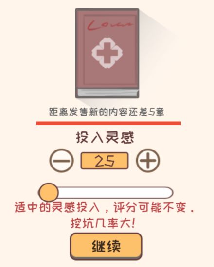 3.然后开始创作,按照刚开始跟大家说的搭配,选择第一个网站,原始分数一定要在八分以上,当大家创作好一本小说,并且发布之后,,奖励系统得到的钱至少可以满足1000元以上(放心吧!月底的生活费肯定是够用的!!即使不够用的话,就使用补助,也是没有问题的),用这1000元换一张床,不然的话刚开始的时候体力值很容易不足。第一次投灵感,建议投到25,第二次比上一次灵感投入多增加一,也就是说下一次投入灵感,要投到26,当要保持分数稳定增长,当分数达到十分的时候,投入的灵感,也就是刚开始推荐灵感多增加二(此方法只限于第一本书)(在后期的时候,除非原始分数直接就是十分,建议刚开始暴涨分数的时候,总是要比原始分数高5到9,一旦到达十分,投入灵感只需要比推荐灵感高二就可以了。)对于刚开始的策略,本人建议是使用迎合搭配突破,让订阅人数快速增长,如果恰好赶上,马上就要评奖,那么建议使用突破搭配沉淀,在大纲内分数增长更快!!!然后就一直更新到20章,建议一直使用迎合搭配突破,此时的订阅应该大约是在一万左右,15章的时候应该已经签约出版,20章的时候应该是有电视剧改编,并且书已经出版,第一本书建议截止到,出书的版费完全交给你之后完结(如果正好赶上要评奖,那就等到评讲之后再完结,当然,你要确保你的分数是在十分)。(仅限第一本书)