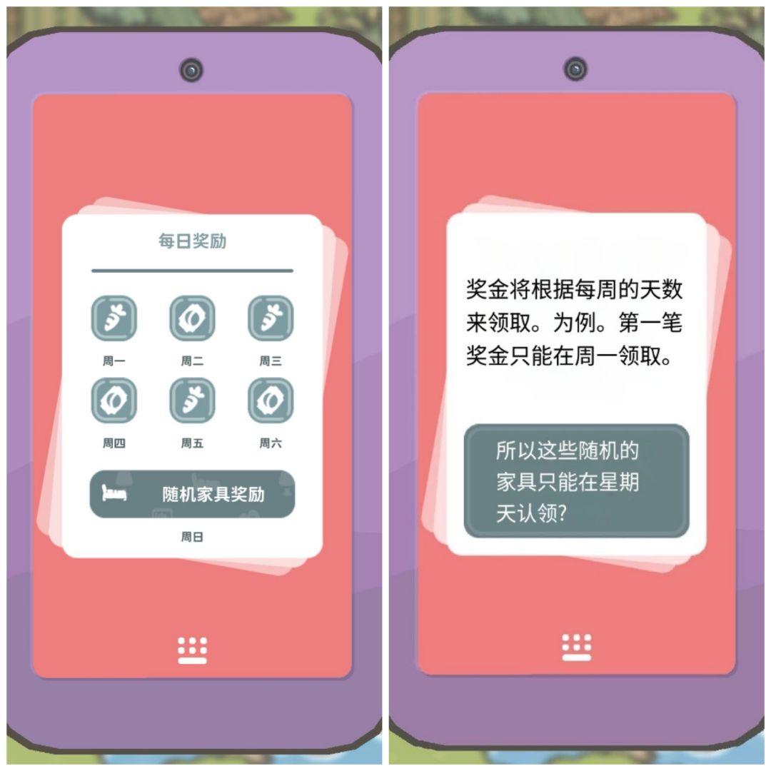 ①完成第一周签到后,有段英文大意是“之后签到奖励和星期对应,不再签够7天才能拿家具”。举例子:周日登录就能拿家具,之前签没签都不影响。周三登录只能拿到第3个(周三)的奖励。