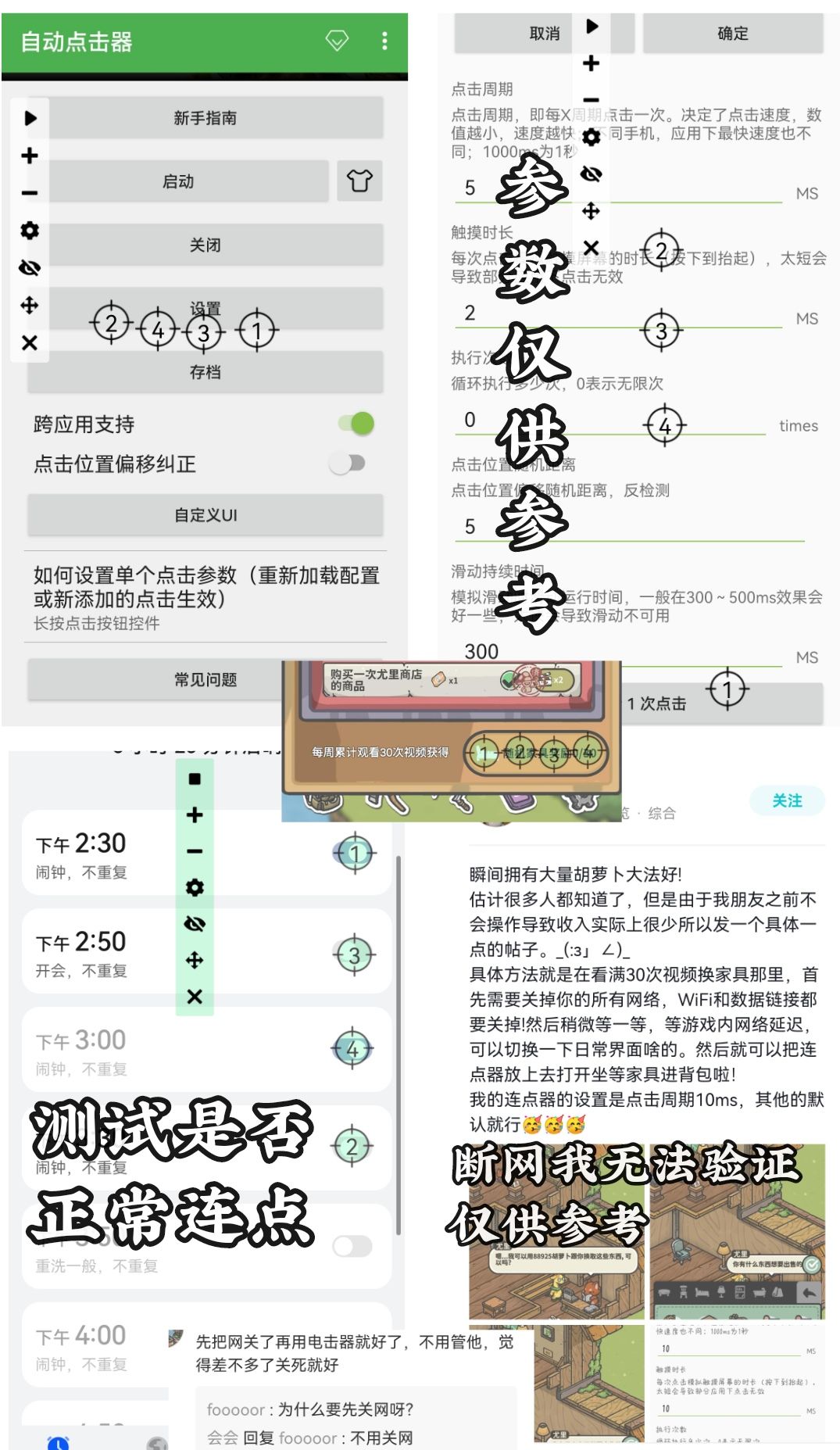 ❗️注:①按浮窗的播放键开始点击,先测试是否真的在点击(我用闹钟开关按钮),没反应的话清除后台,按【新手指南】重设权限,再来一次。