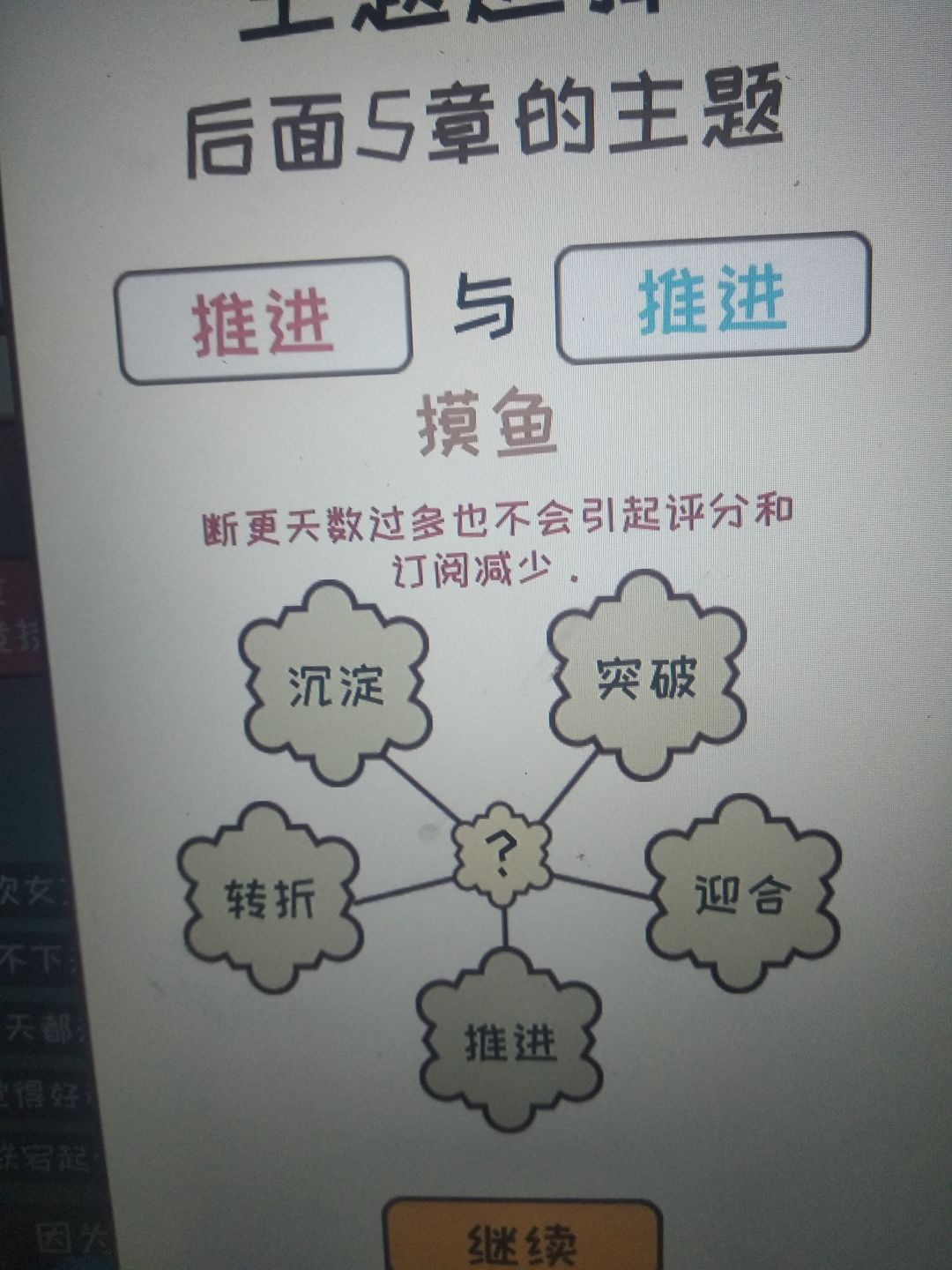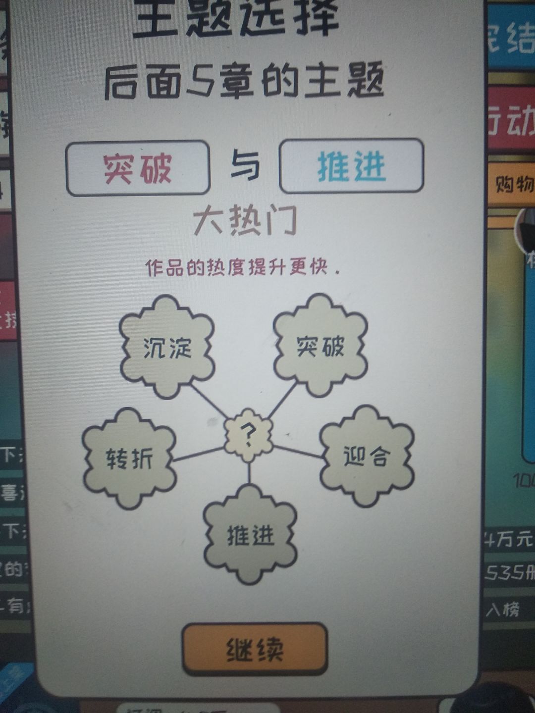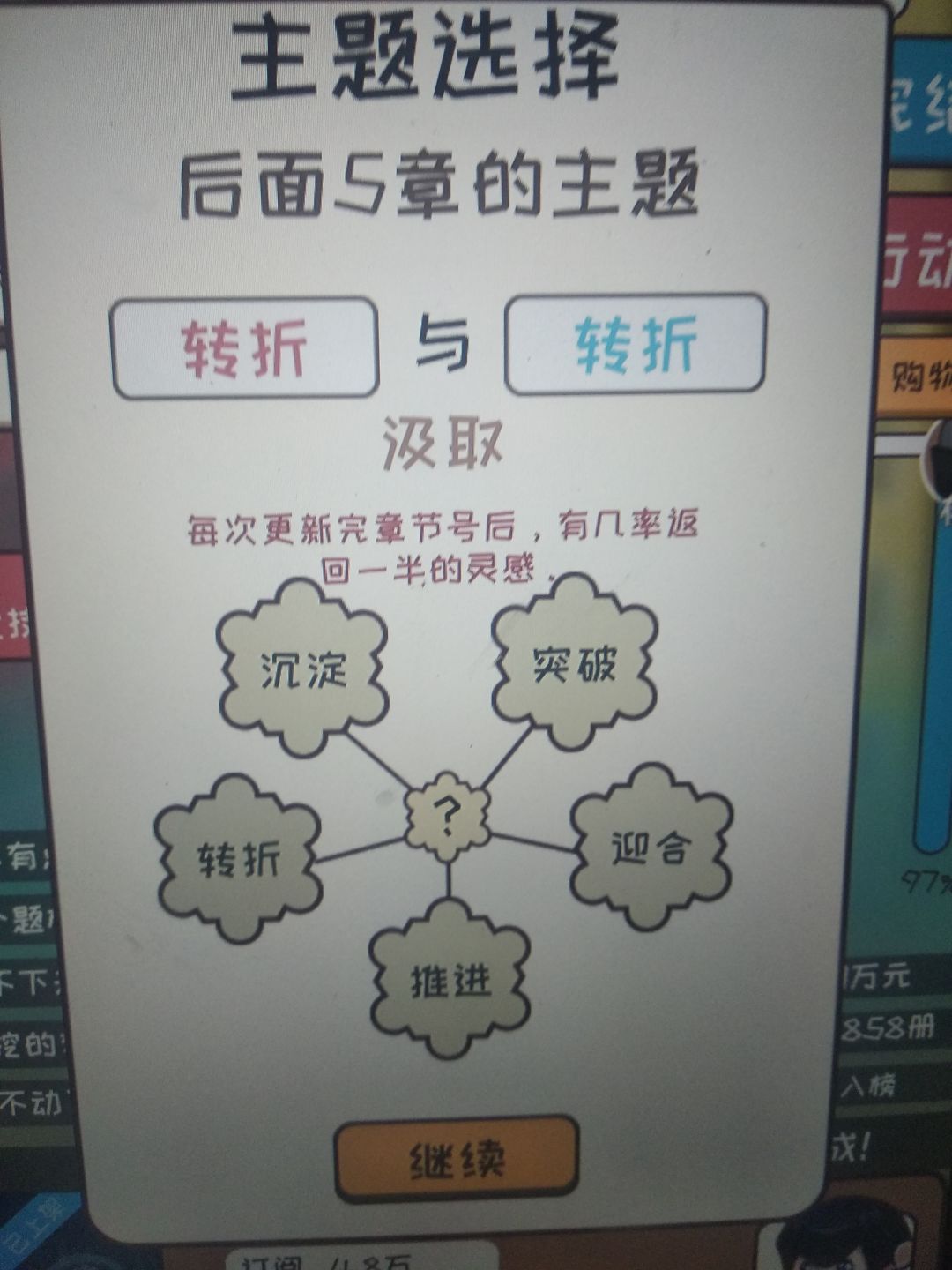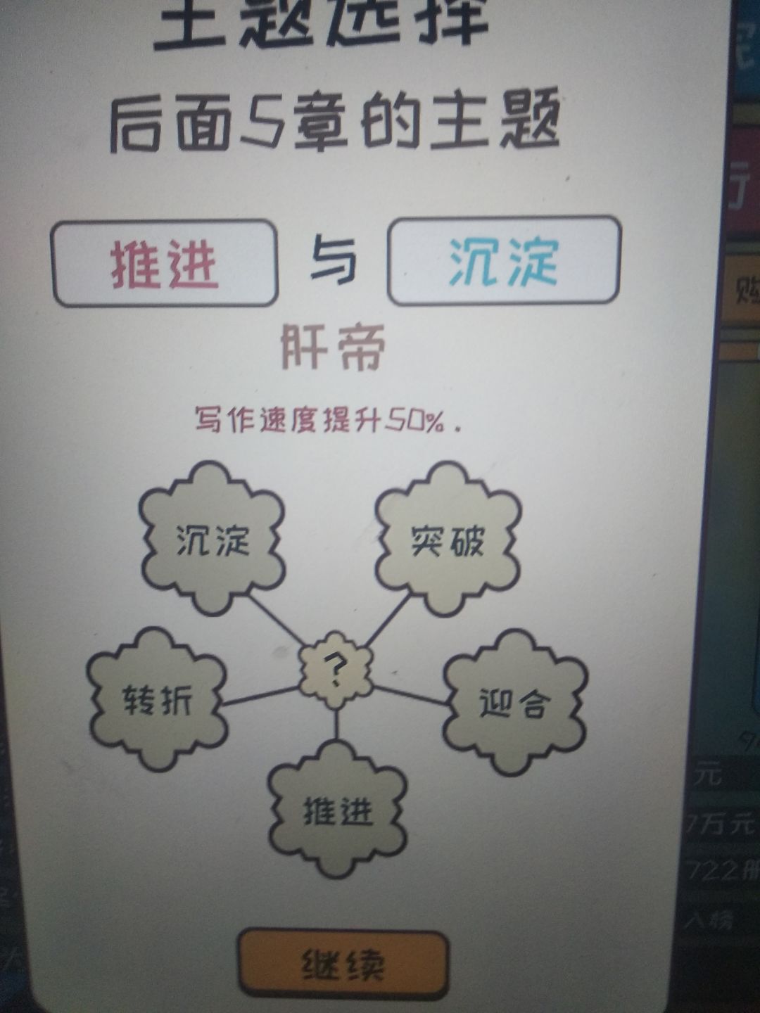 只要是很不错和太好了就行。很不错是7分,太好了是8分。一开始灵感从行动那给,更新最好全是大量灵感更新,这样可以快速刷到9分,然后更新到三十涨左右,然后一直0灵感刷钱到6.0完结,然后用来提升文笔速度之类的,这个无所谓,不过推荐先升一下速度,然后重新开一本,继续去最差的平台刷一波,然后可以去18k网站了,去之前记得基本属性大于50哦,然后就一直刷。对了一开始的3000元去购物买一台电脑。主题选择给你们发一下效果