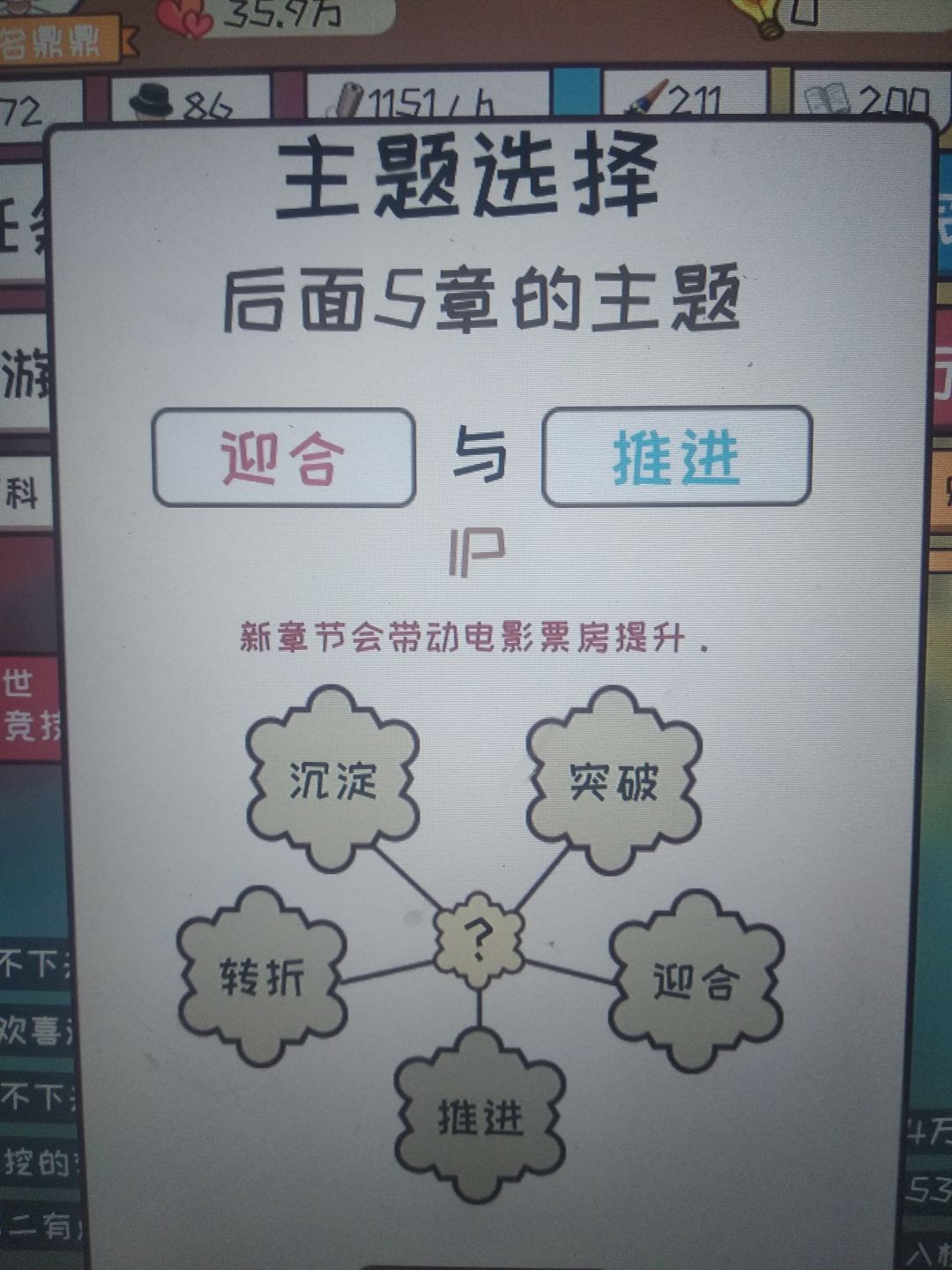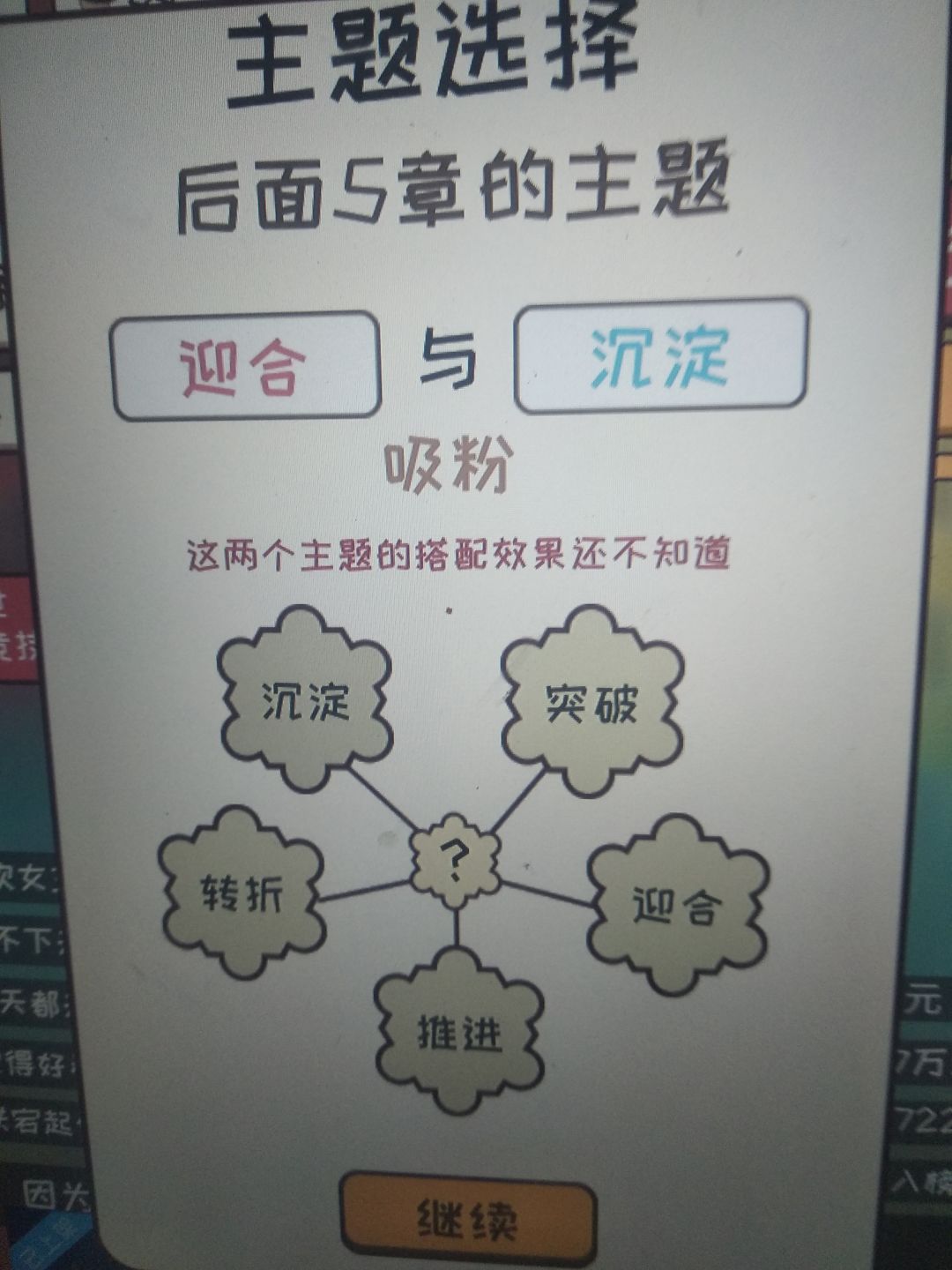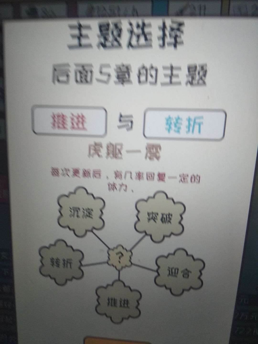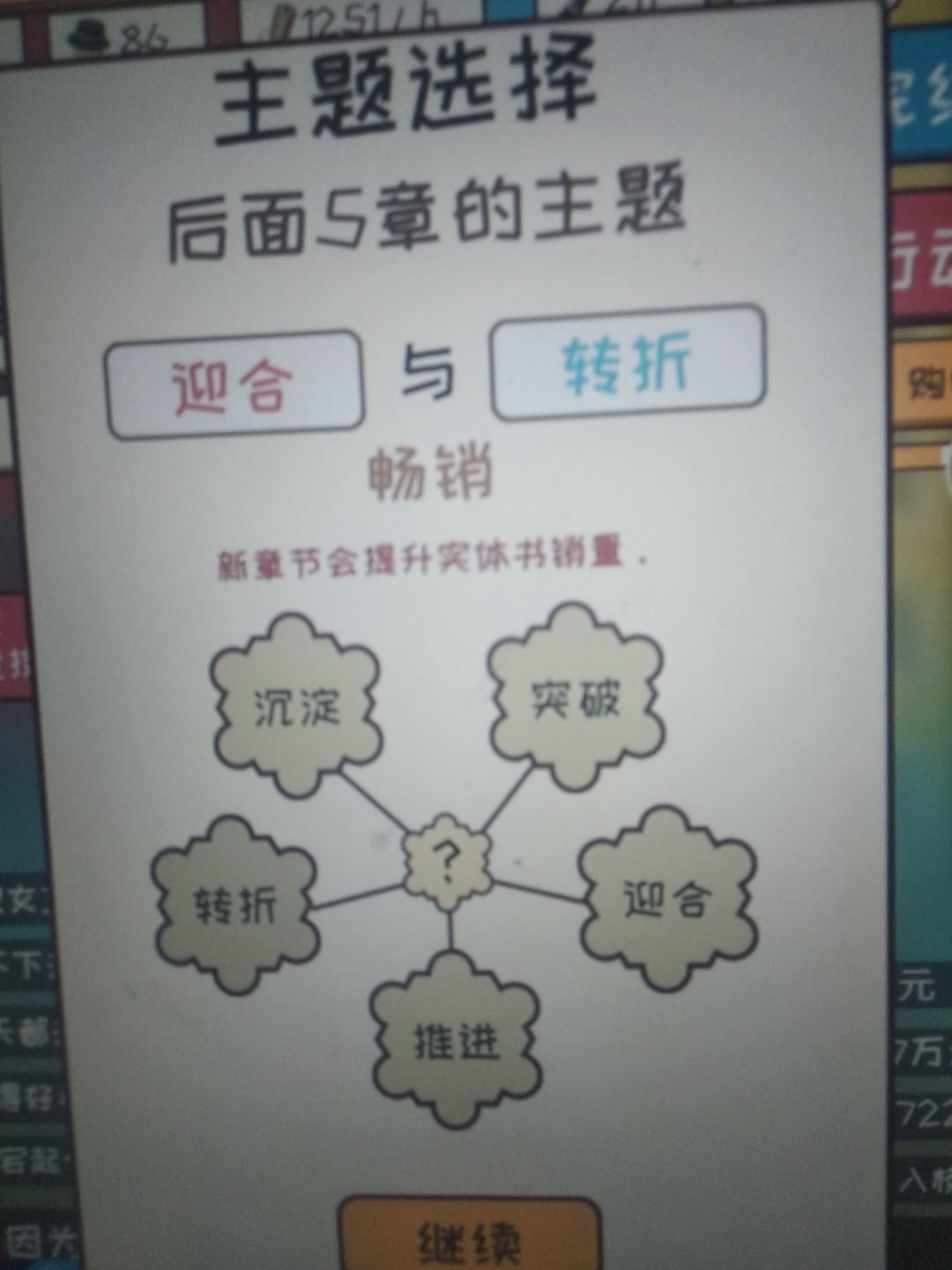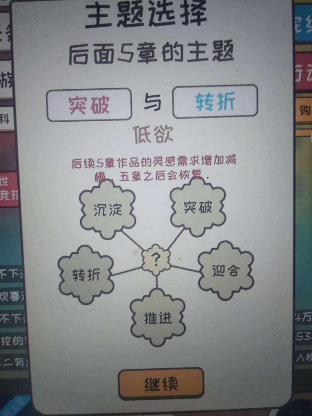 只要是很不错和太好了就行。很不错是7分,太好了是8分。一开始灵感从行动那给,更新最好全是大量灵感更新,这样可以快速刷到9分,然后更新到三十涨左右,然后一直0灵感刷钱到6.0完结,然后用来提升文笔速度之类的,这个无所谓,不过推荐先升一下速度,然后重新开一本,继续去最差的平台刷一波,然后可以去18k网站了,去之前记得基本属性大于50哦,然后就一直刷。对了一开始的3000元去购物买一台电脑。主题选择给你们发一下效果