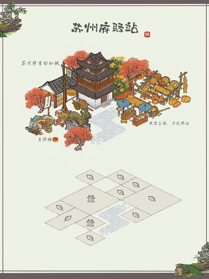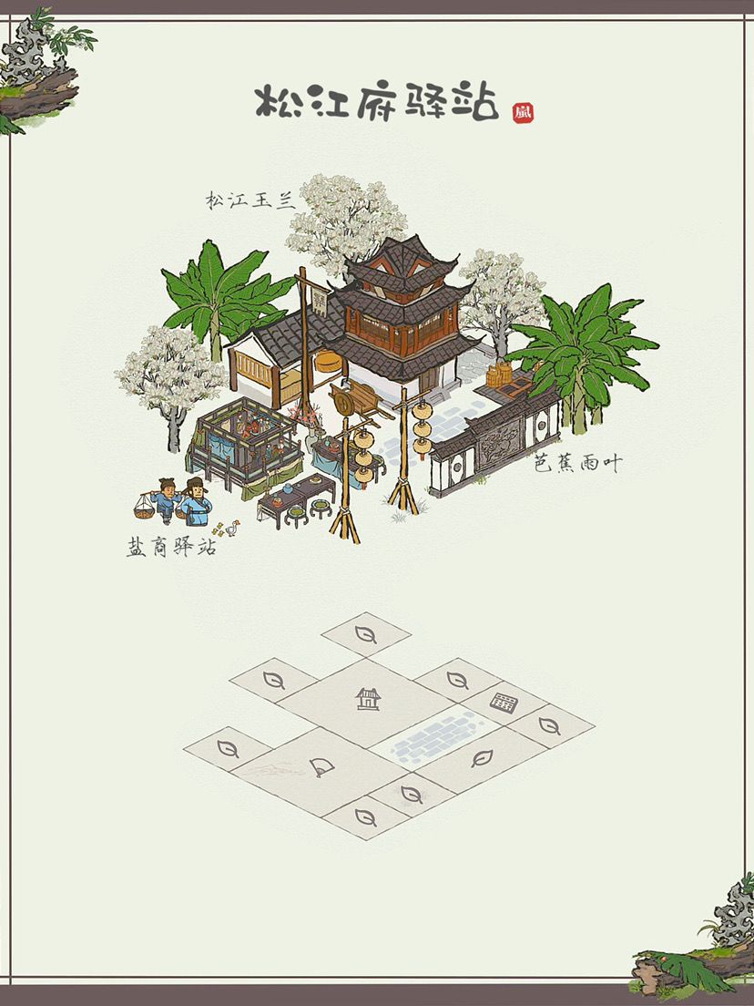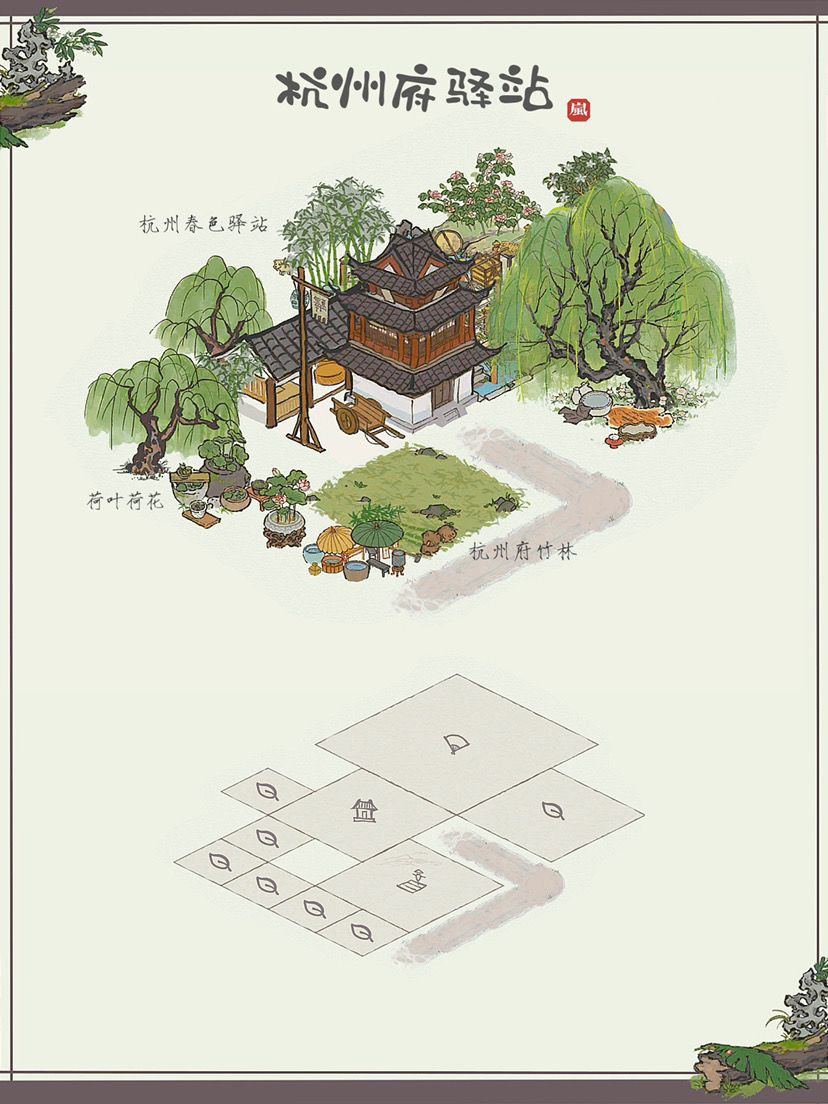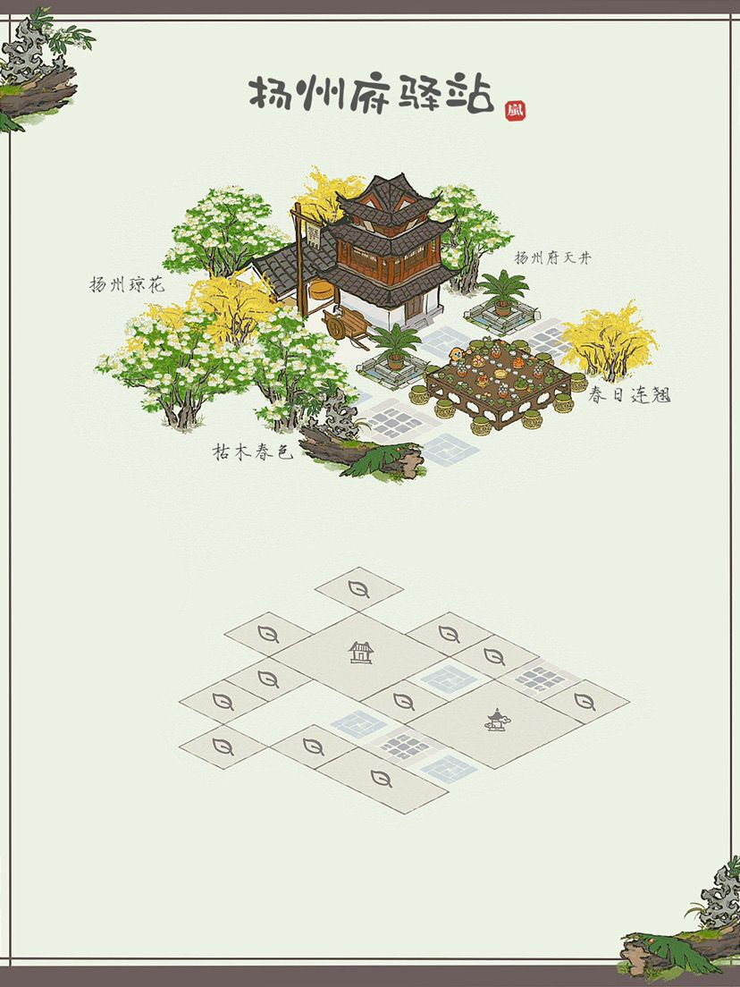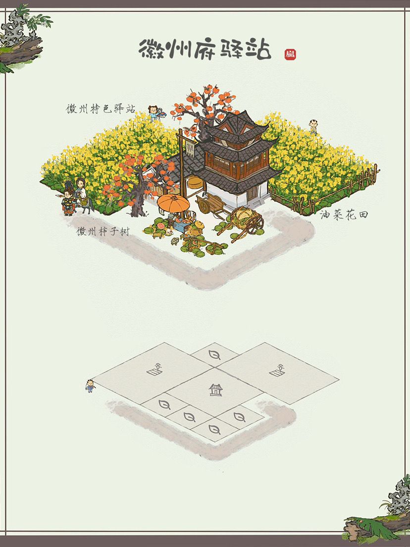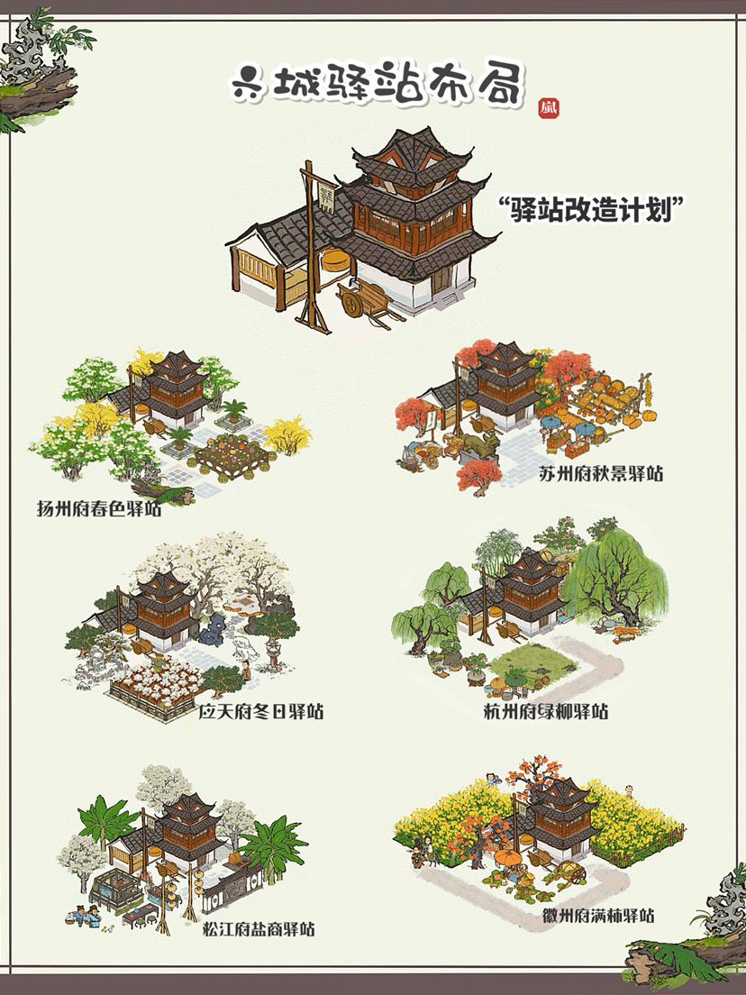 🐾整体布局方法:我最爱的“折线路法”布局,自上而下的曲折布局法。❥.应天府驿站布局:应天府棉花地是白色系的,樟树也很适合搭配冬景,适合放在应天城外或者应天右上角单独做一片冬景。❥.苏州府驿站布局:苏州比较适合搭秋景,秋季限定可以放在苏州做秋季系列的布局,月饼摊和兔子摊是中秋的小礼包秋意满满。❥.杭州府驿站布局:杭州莺莺河畔系列的建筑太适合搭春景了,配上绿柳和竹林的绿地再搭配一些小零件很具有杭州特色。❥.松江府驿站布局:松江府特色是盐商和白玉兰还有芭蕉树,适合做白绿黑的一个配色的布局,小灯笼路灯照亮来驿站的路,这个布局比较明显的缺点就是路不通,路通电话姐妹可以适当修改。❥.徽州府驿站布局:徽州的柿子树和油菜花是特色,可以和驿站搭配一个具有徽州特色的驿站,驿站门口卖瓜应该会卖的很好吧。❥.扬州府驿站布局:扬州整体色调都比较亮,如果想搭配一些春色比较清丽的布局可以选择黄白绿搭配,当然扬州的海棠还可以搭成粉色系驿站,有兴趣的姐妹可以自己尝试。