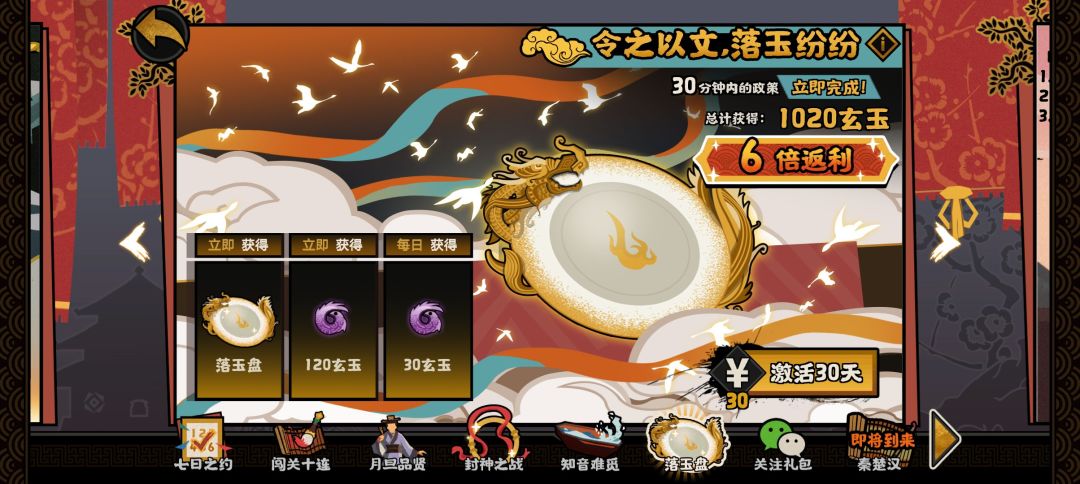 ①1020个玄玉(购买后可以获得120个,另外每天可以领取30个,持续30天了)