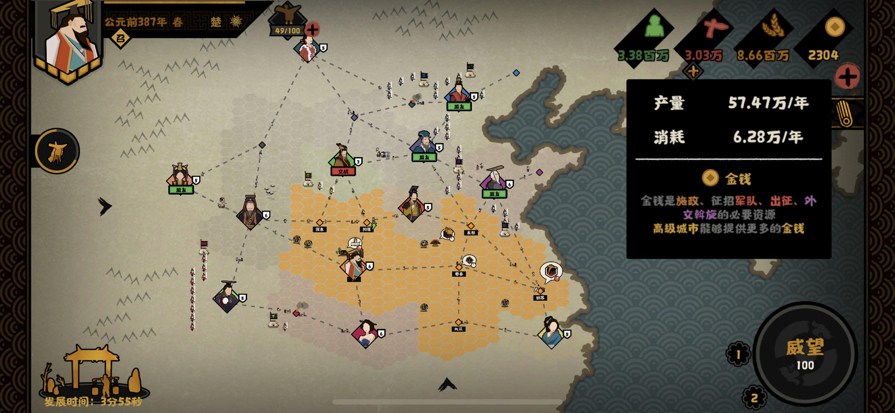 接着是义渠成为盟国后金币(金币产量甚至只多了3k)(看人口,时间没差多久的,中途我没点过科技,城建升没升记不清了,大概是没有的)