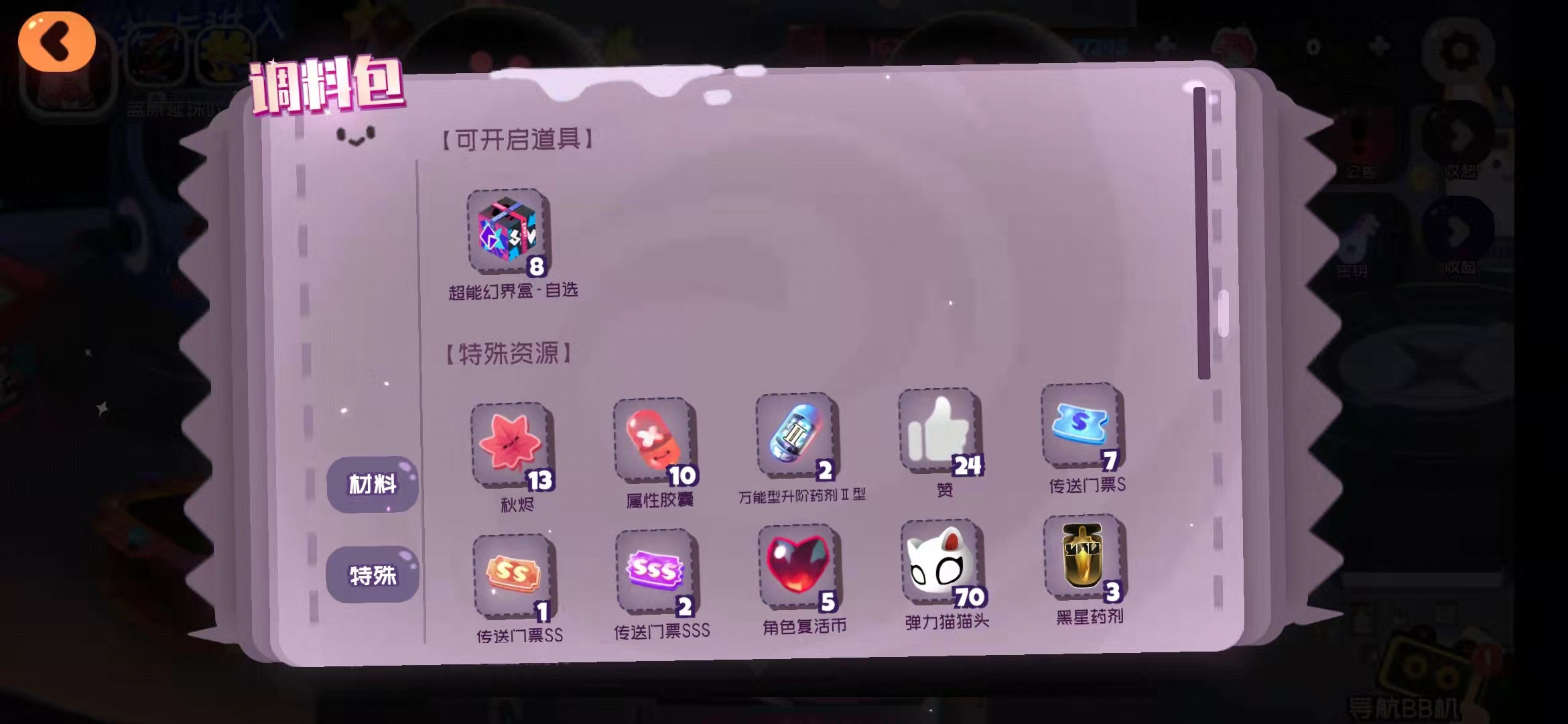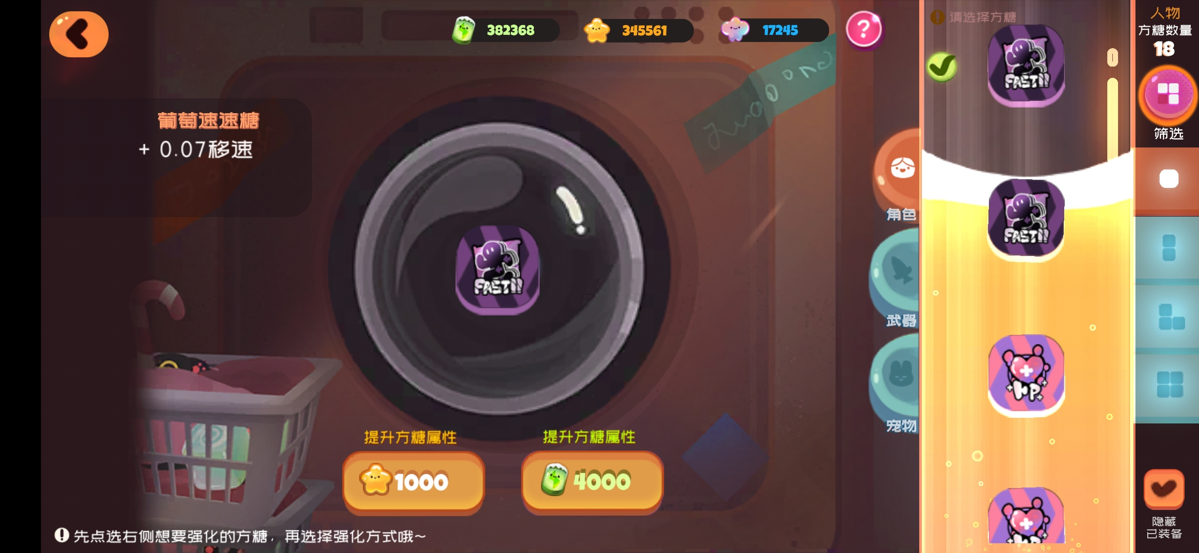 然后,升级糖,用这个黄颜色的星星,不要用电池,至少,以我目前的情况来说,我人物和宠物,还有武器,50级了一大堆,电池,不够用,反而黄颜色的星星,因为,糖的出产量有限,一直都用不完。