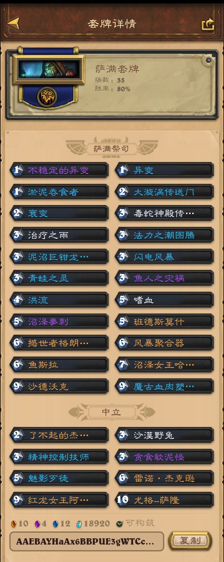 这是一套我在狂野5000分段左右划水的萨满卡组,打了35把,最终以80%的超高胜率让我不得不分享给大家