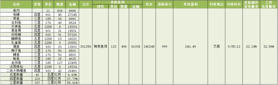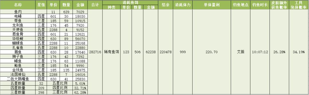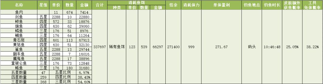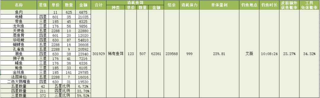 钓鱼收益测算(五级鱼杆+星星鱼竿皮肤+大鱼套+稀有鱼饵(四星))