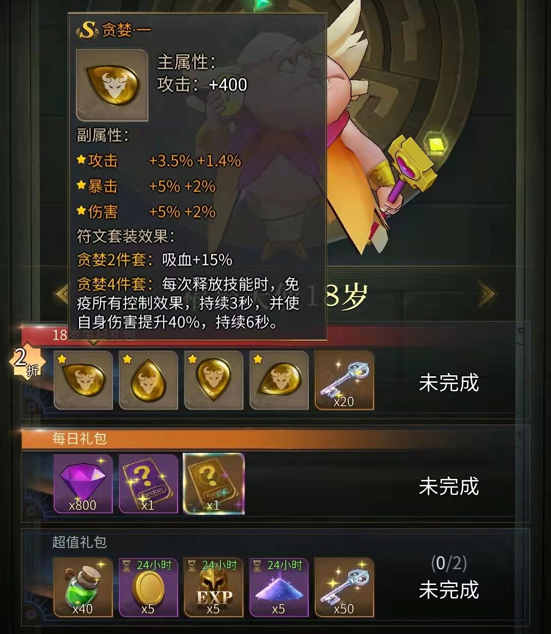 吸血、免控、高额增伤,强到变态的输出效果对应的是苛刻的获取条件。目前贪婪符文的获取只能通过福报天使18岁的生日礼包领取。有条件的勇士大人,一定要抓紧机会升级福报天使啦~
