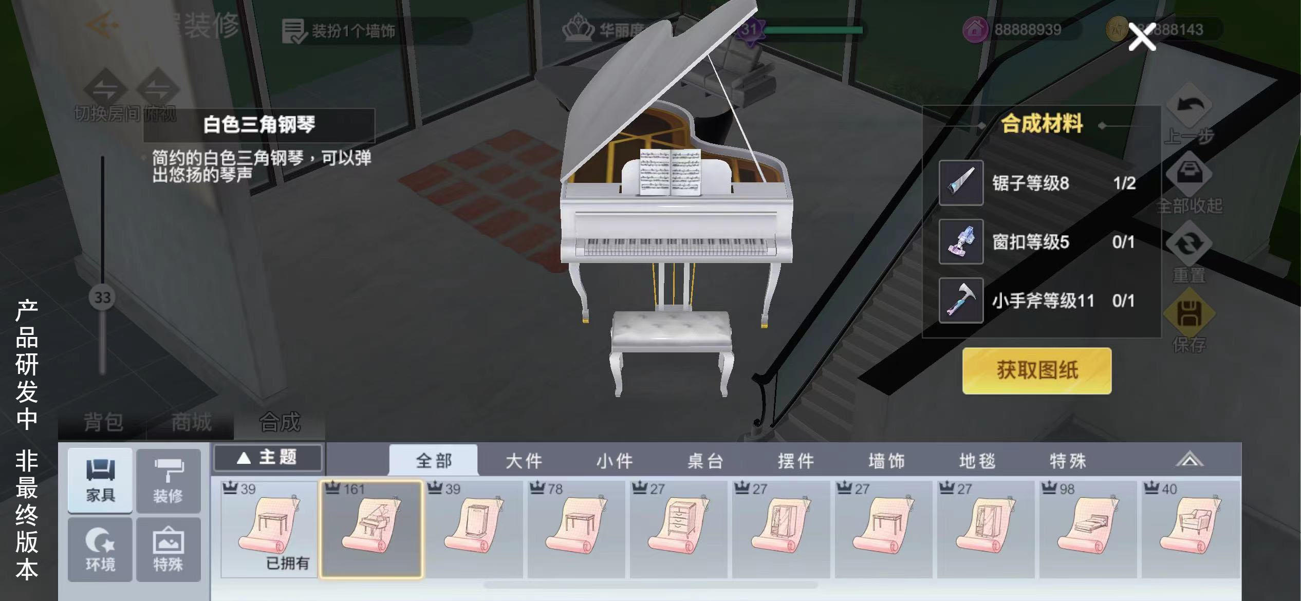 小屋等级达到4级时解锁合成功能。在合成界面跟随指引获取家具图纸,点击图纸即可看到合成所需材料。从内置趣味小游戏中一点一滴收集材料,合成那款心仪已久的绝美钢琴,成就感满满。