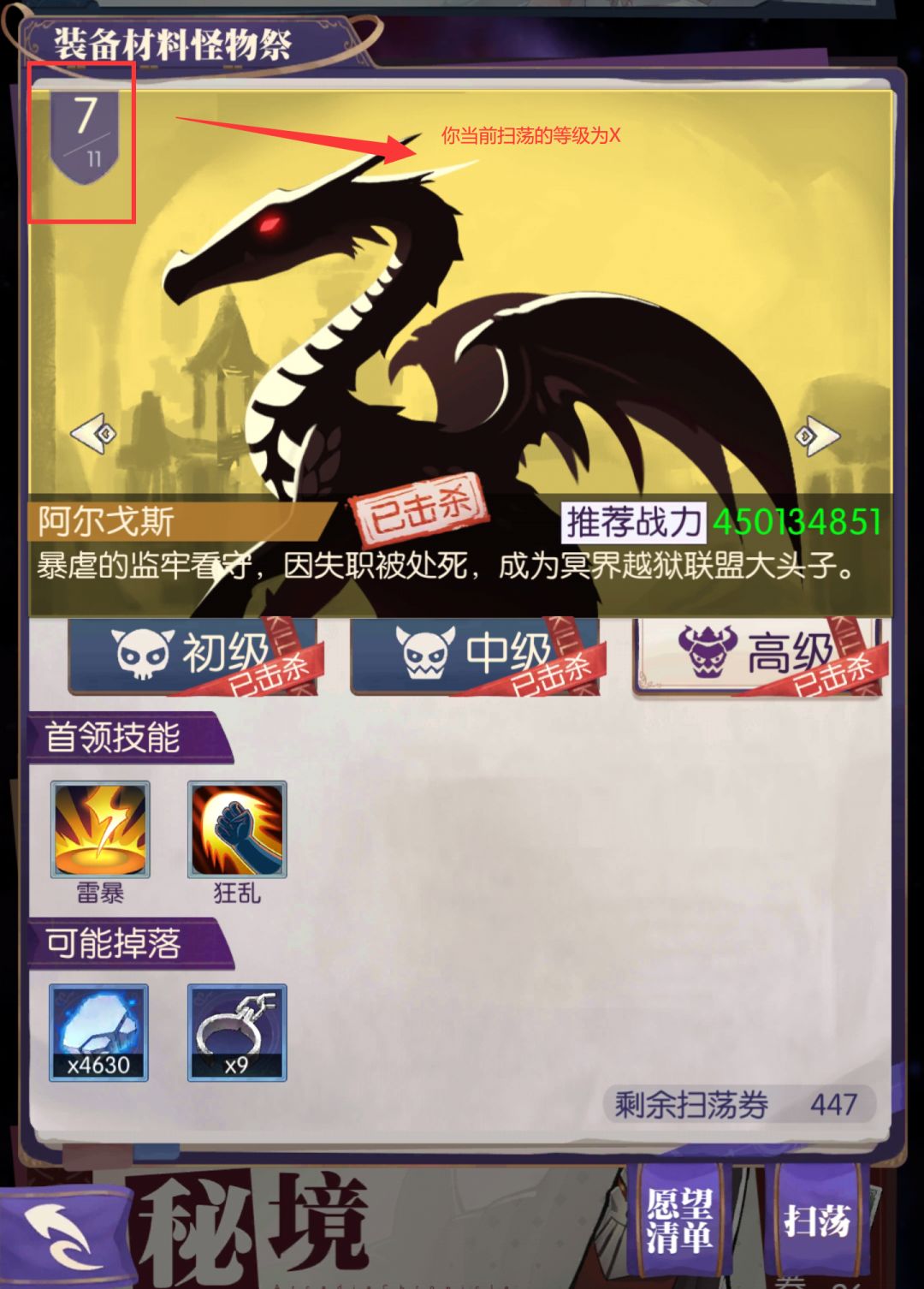 如图,你当前扫荡的怪物祭等级为X,Y为你预计的满级天数。