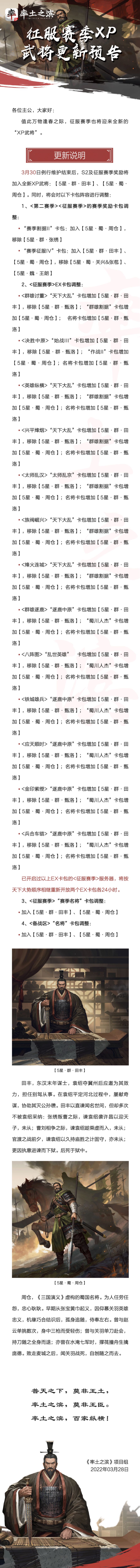 《率土之滨》3月30日征服赛季XP武将更新预告