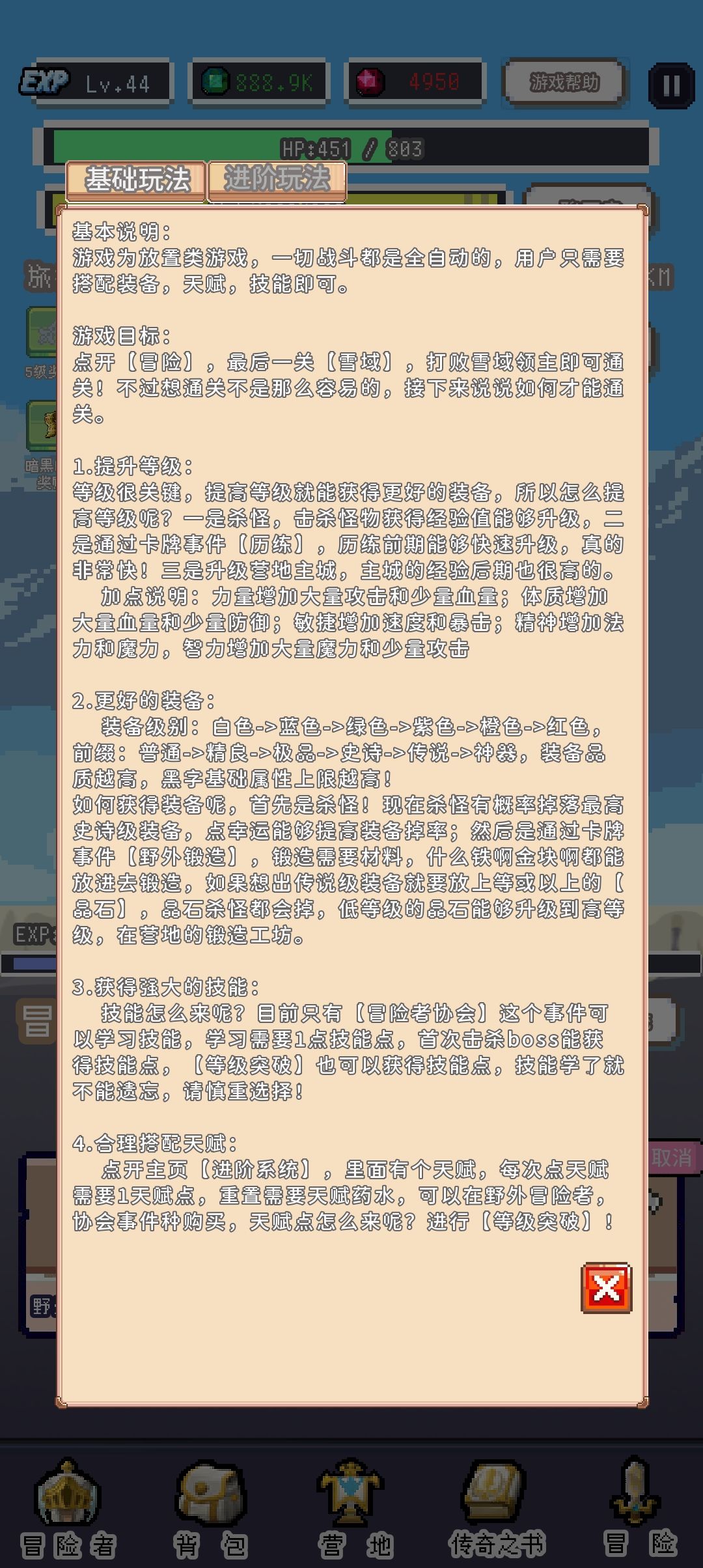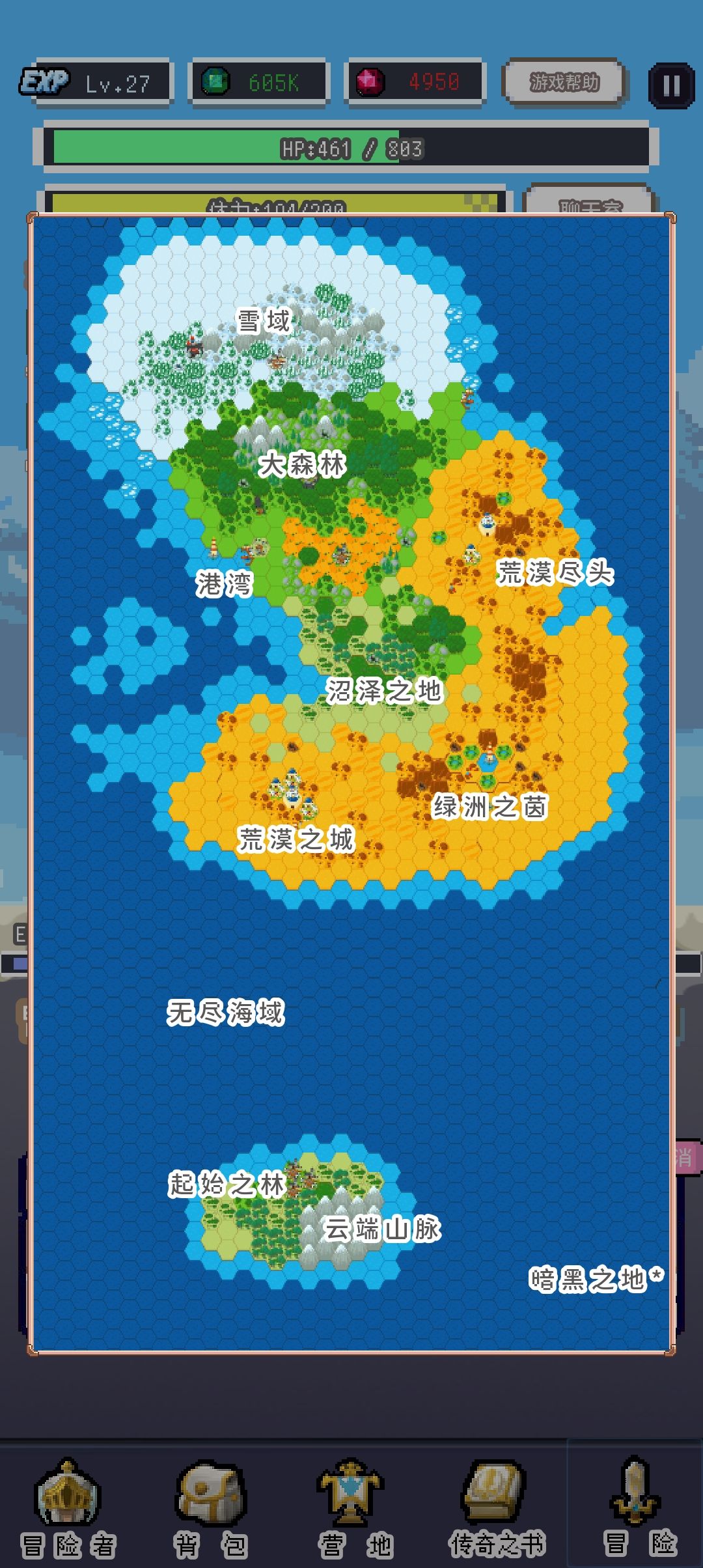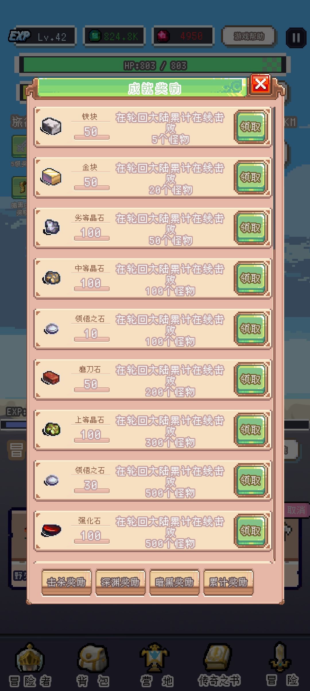 主要作用就是刷暗黑碎片和升级冒险者勋章以及提升重生的收益(重生的收益会根据人物等级、勋章等级、冒险地图进度、暗黑之地进度、深渊进度增加)技能升满级之后就可以一直挂在这里了,需要注意的是暗黑之地的怪物有远程伤害减免,3个会远程的角色请不要在暗黑之地打深渊