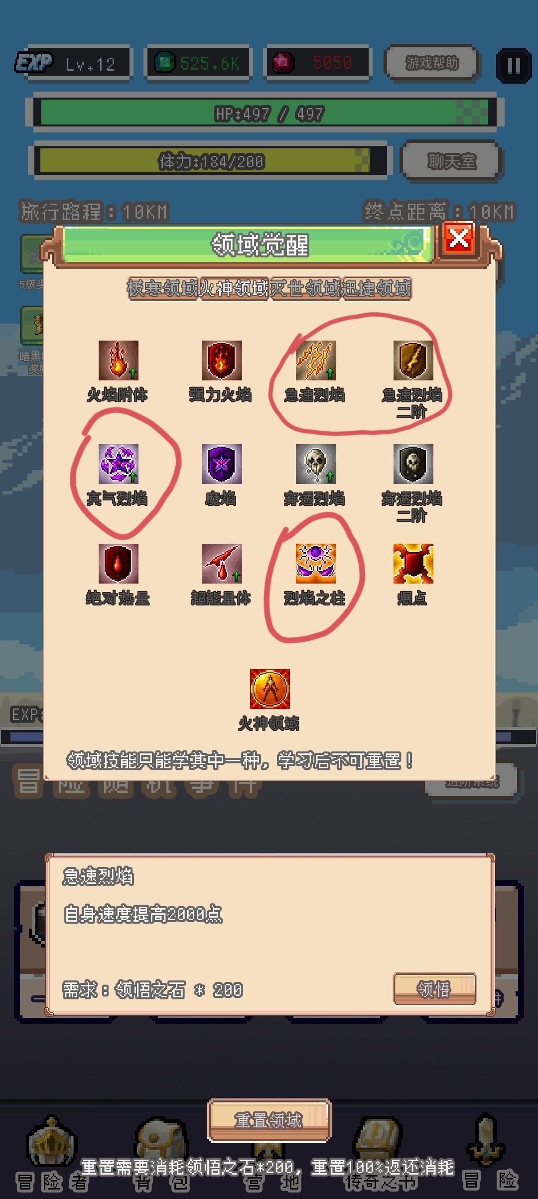 以勇者为例:领域技能-火神领域-急速烈焰和真气烈焰 烈焰之柱(除了灭世领域其他领域都有加速度的技能,所以女武神前期就和勇者一起用火神领域吧)