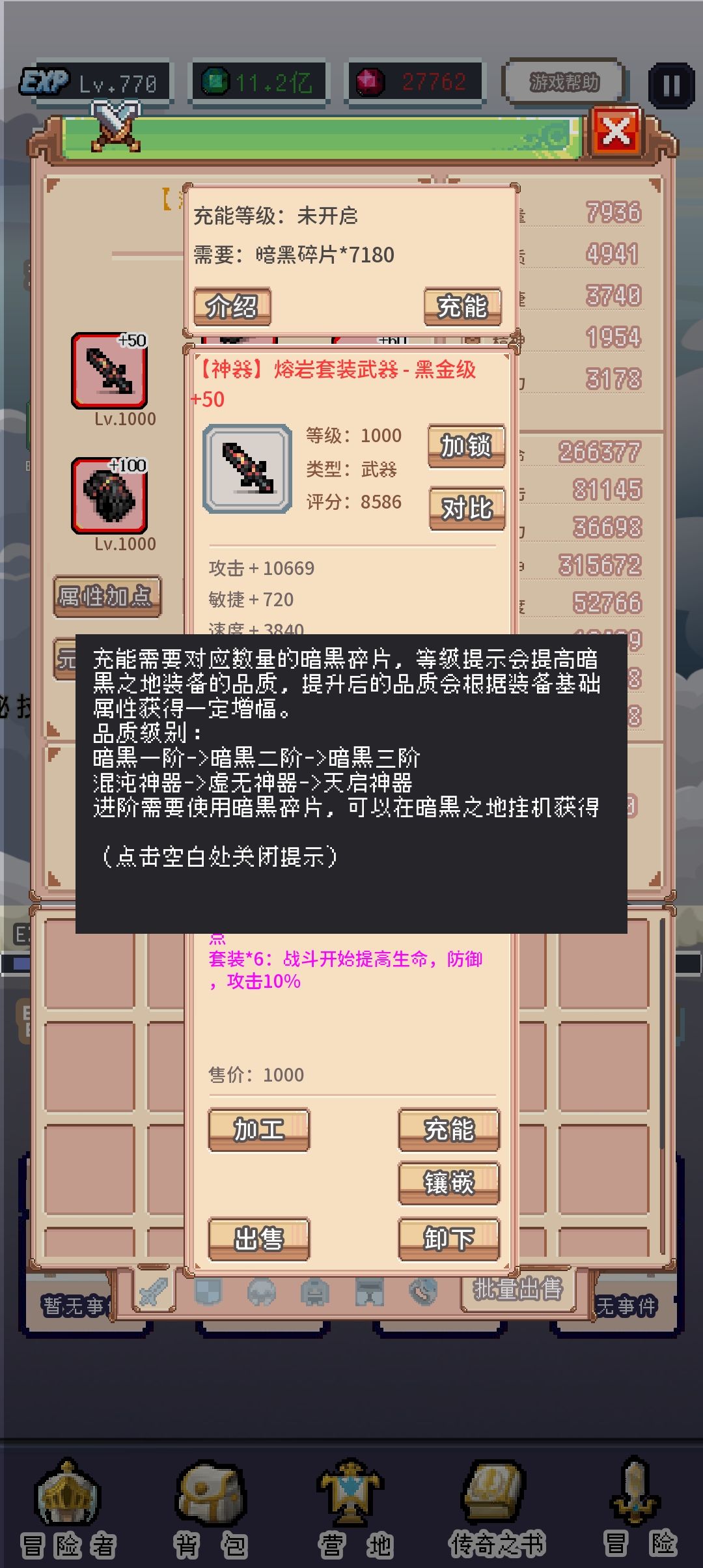 充能:消耗暗黑碎片对装备进行一定增幅(前期不用管)