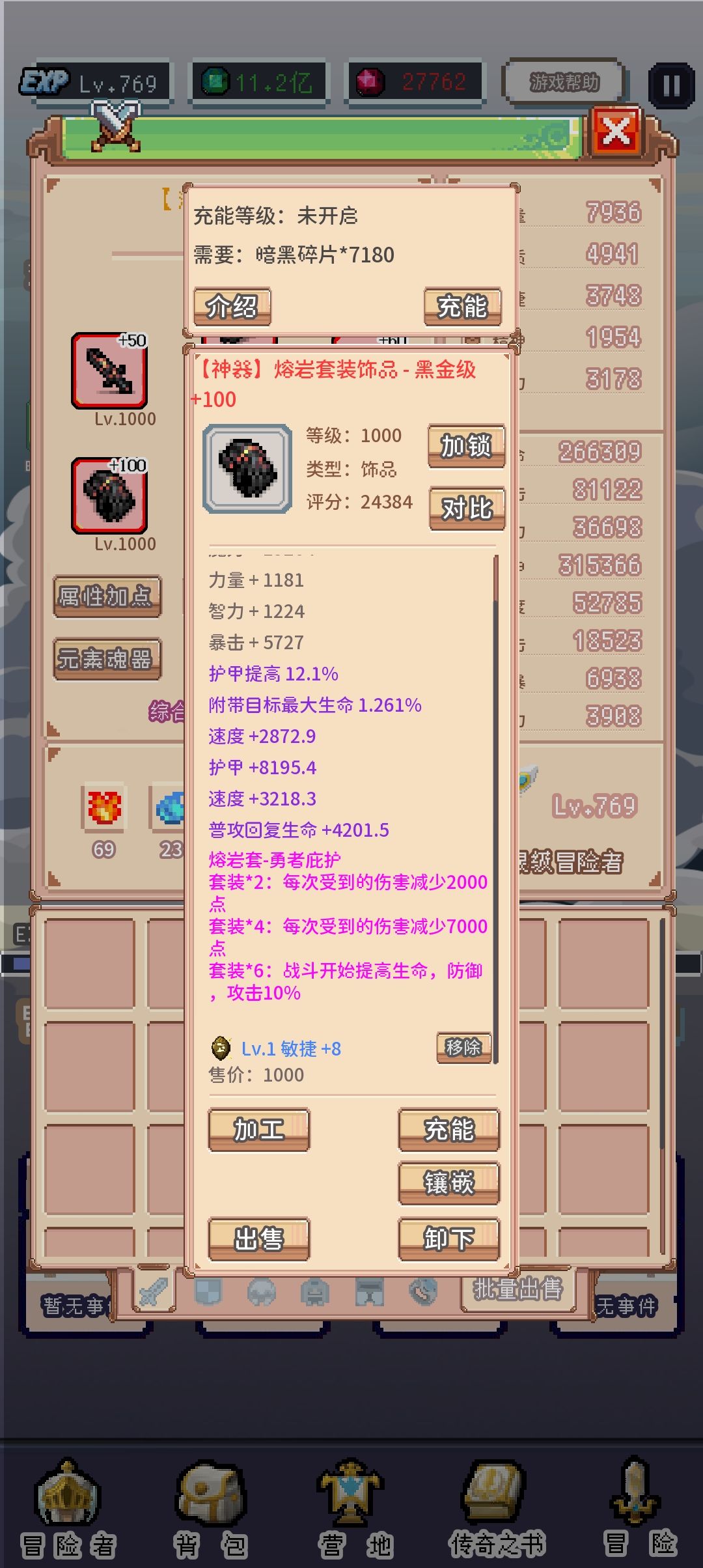 点击装备后可以对该装备进行加工、充能和出售