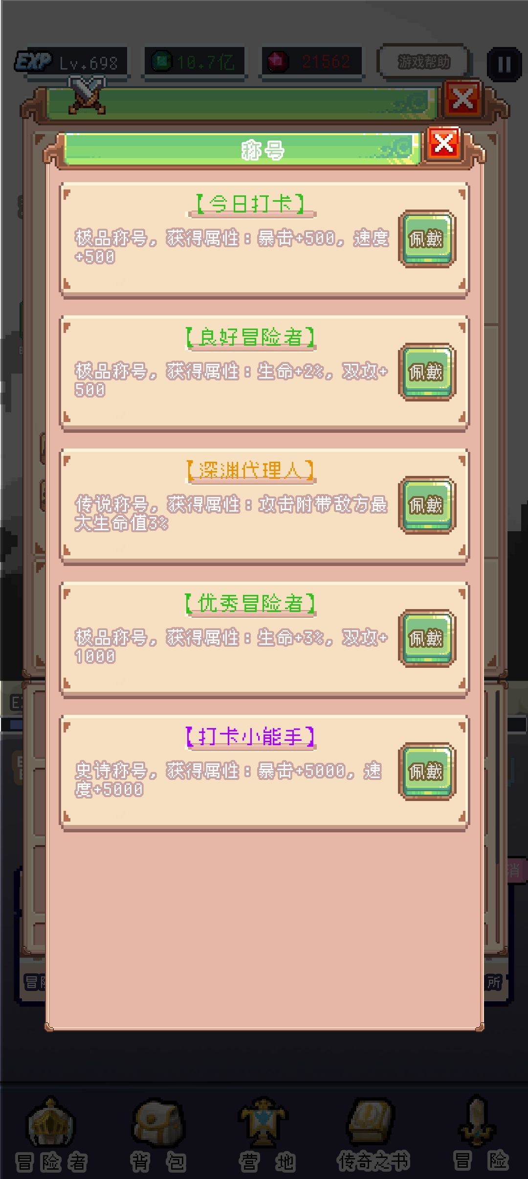 冒险称号:佩戴称号可获得加成,完成成就获得