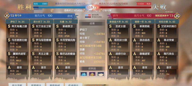 英雄很简单就是三个。接下来就是重点技能搭配,一个好阵容离不开技能的搭配。首先是萨拉丁,萨拉丁第二个技能上乌尔班射石炮,这个相信大家没有疑问,为主将萨拉丁直接加65点力量额外还会发动一次攻击,对于高爆发的萨拉丁来说最好不过了。另外一个技能是翼骑兵进军,这个技能玩过s1都知道特别难出。目前是萨拉丁天花板技能。该技能包含三大属性,高爆发攻击,免控,禁疗。诺曼征服和翼骑兵进军选择。在s1诺曼征服和翼骑兵进军都是萨拉丁非选不可的技能,在奶突队因为石炮加力量配合天主之盾力量前几回合能打出高爆发伤害。翼骑兵有高爆发输出,另外诺曼征服是劝降不能触发天主之盾,这里选择翼骑兵最佳。