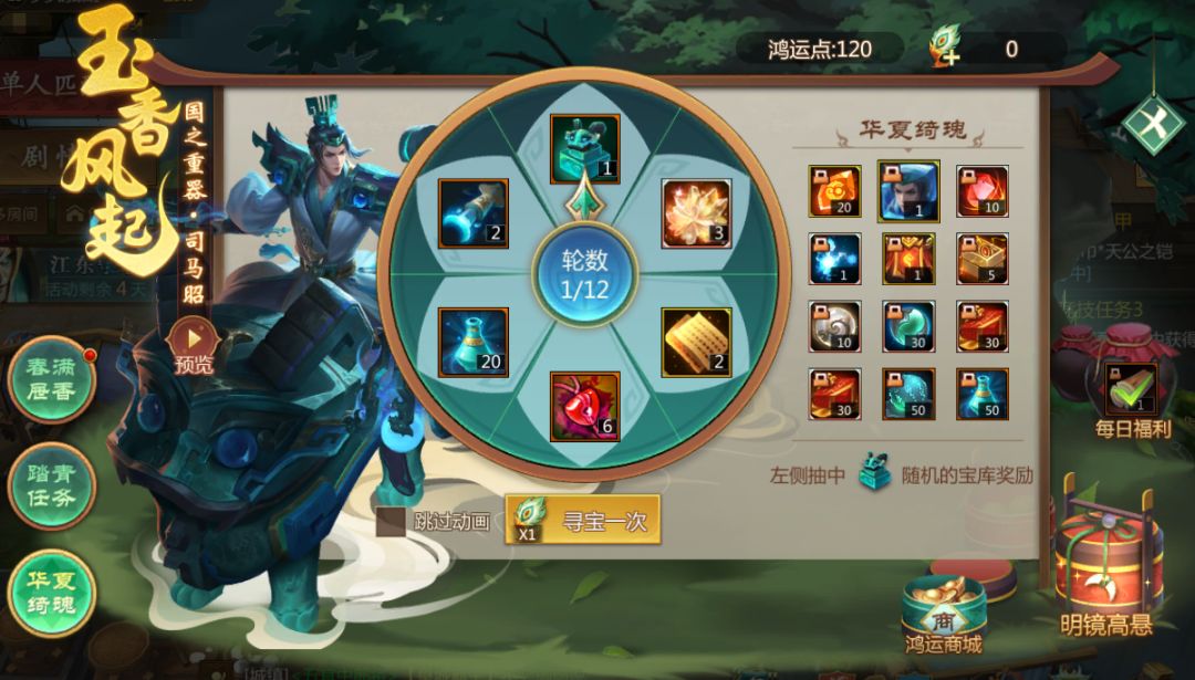 1、消耗青鸾翎参与寻宝,每抽必中,奖励不会重复获得,共有12轮奖励。