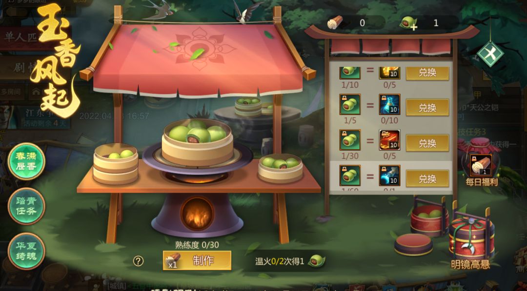 在春满屉香中,大家可以通过踏青任务获得的木柴,通过消耗木柴制作青团。