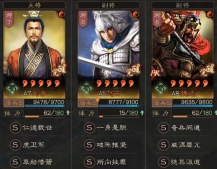(主将)刘备,战法搭配:草船借箭+虎卫军 兵书——援其必攻+驰援+掩虚 (副将)赵云,战法搭配:破阵摧坚+所向披靡/卧薪尝胆 兵书——以治击乱+鬼谋+神机 (副将)魏延,战法搭配:威谋靡亢+绝其涉道 兵书——胜而+胜战+执锐 接下来看看PVP的战报情况: 出门首战碰撞“太尉盾”,还是满红典藏版本之子,还剩两万出头的兵力就获胜了! 打满红五虎枪,战损和前面打太尉盾差不多,也是比较舒服的。 打顶配武锋群盾,也没有太大的问题。 碰撞桃园就是纯碾压了,只能说桃园这个队伍没熊烈还是差了点,优势的话是相对容易组共存。 总结:带草船借箭和虎卫军的刘备,相信大家还是比较少见的,实战来说打各种高红满红主流队伍基本上都没太大的问题,尤其是对抗其他的盾兵体系,基本上都是优势为主,并且这个阵容也拥有比较高的上限,有高红度魏延的情况下还是值得一玩了!如果要说赵云玩盾兵的缺点,那就是需要盾兵宝物,当然没宝物也能玩,只是强度要稍微弱一些,并且这个队伍吃到的战法也不算太低,感兴趣的玩家可以尝试玩一玩。最后,魏延这个武将如果不红,有威谋靡亢也算是平民逆袭高红的一大神将!