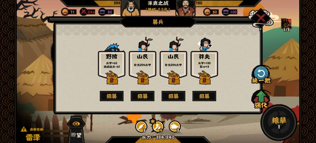 随后的关卡基本一致,粮草思路也是据点要兵,买到70军心(注意不要买多)然后加两次战力,这条线可以买一下野兽加成,最后的兵力大概在800-600+的一个状态,基本可以随便玩了。