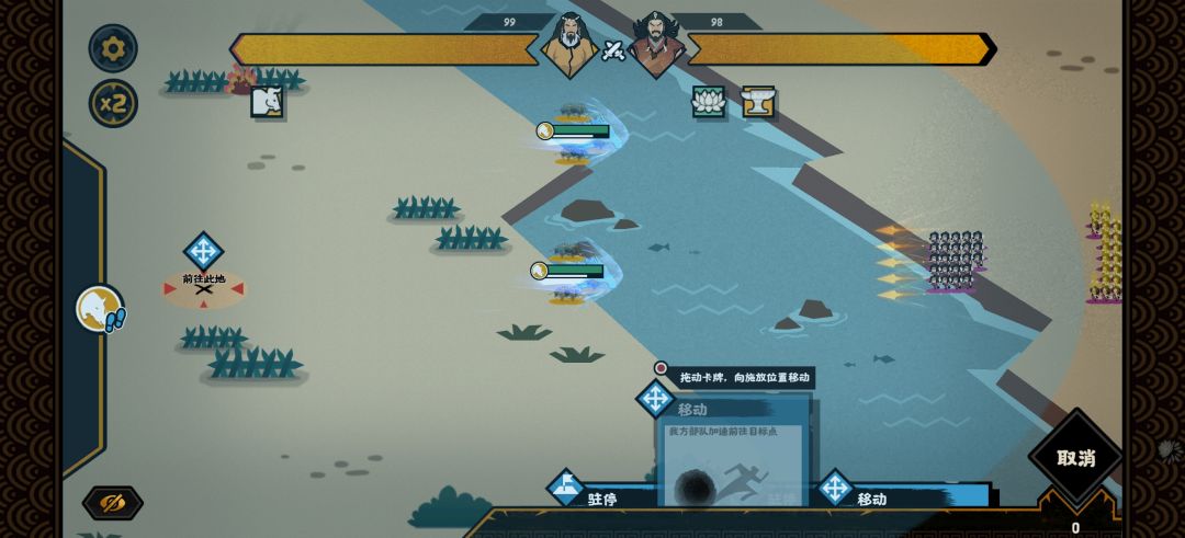 那正确的做法是先让部队走到跟前A2-3下,后拉一次,部队开始拥挤取消移动,对方快要碰触的时候再次后拉至大后方,随后短兵相接时连续两个驻停即可过关