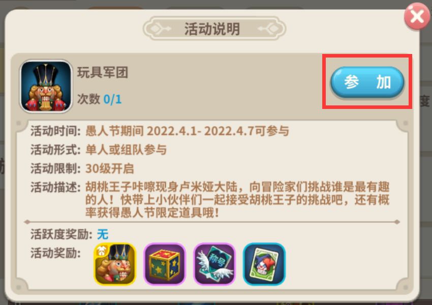 活动期间,快带上小伙伴们一起接受胡桃王子的挑战吧,百分百获得欢乐愚人宝箱和小丑卡,概率获得愚人节限定称号以及魔核哦!