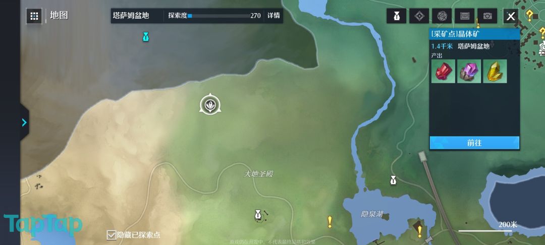 其中矿石为金属矿石,分为两分别是铜矿石以及铁矿石。其中铜矿石掉落的数量更多,掉落的概率的话基本相差不多。在塔萨姆盆地可以采集金属矿石的点有两个,一个是在灵泉镇左下脚的位置,一个则是在大地圣殿传送点的正下方位置。