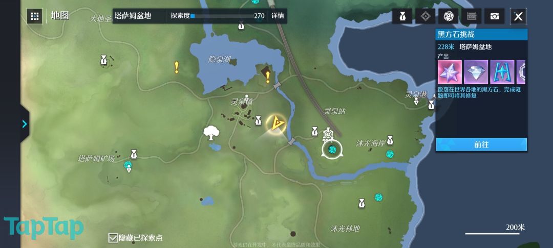 除了宝箱之外在塔萨姆蓬盆地还有一些黑方石挑战,大家可以与宝箱的寻路方式相同,只要通过地图左上角点开显示就可以寻路,不同的是黑方石挑战要解开谜题才能获得奖励哦。