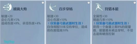 天赋设置上,推荐玩家使用弓箭武器经典的三天赋,玻璃大炮属性满分,完美提升了弓箭职业的输出档次。百步穿杨被动属性加持给力,特效也是很容易触发的增伤神技。狩猎本能赐予了游侠玩家能量盾和部分免控的效果,可以说是PVP里游侠为数不多的自保神技了。