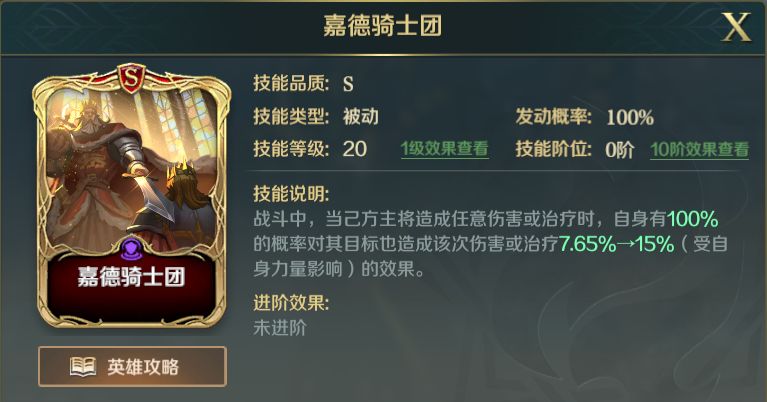 嘉德骑士团作为一个被动技能,所以基本不受控制效果影响。技能特性是当主将造成伤害或在治疗时,自身可增强15%的该次伤害或治疗效果。由此可见,此技能是为团队补充输出或增强治疗效果的,主将的强弱决定了这个技能的强弱。
